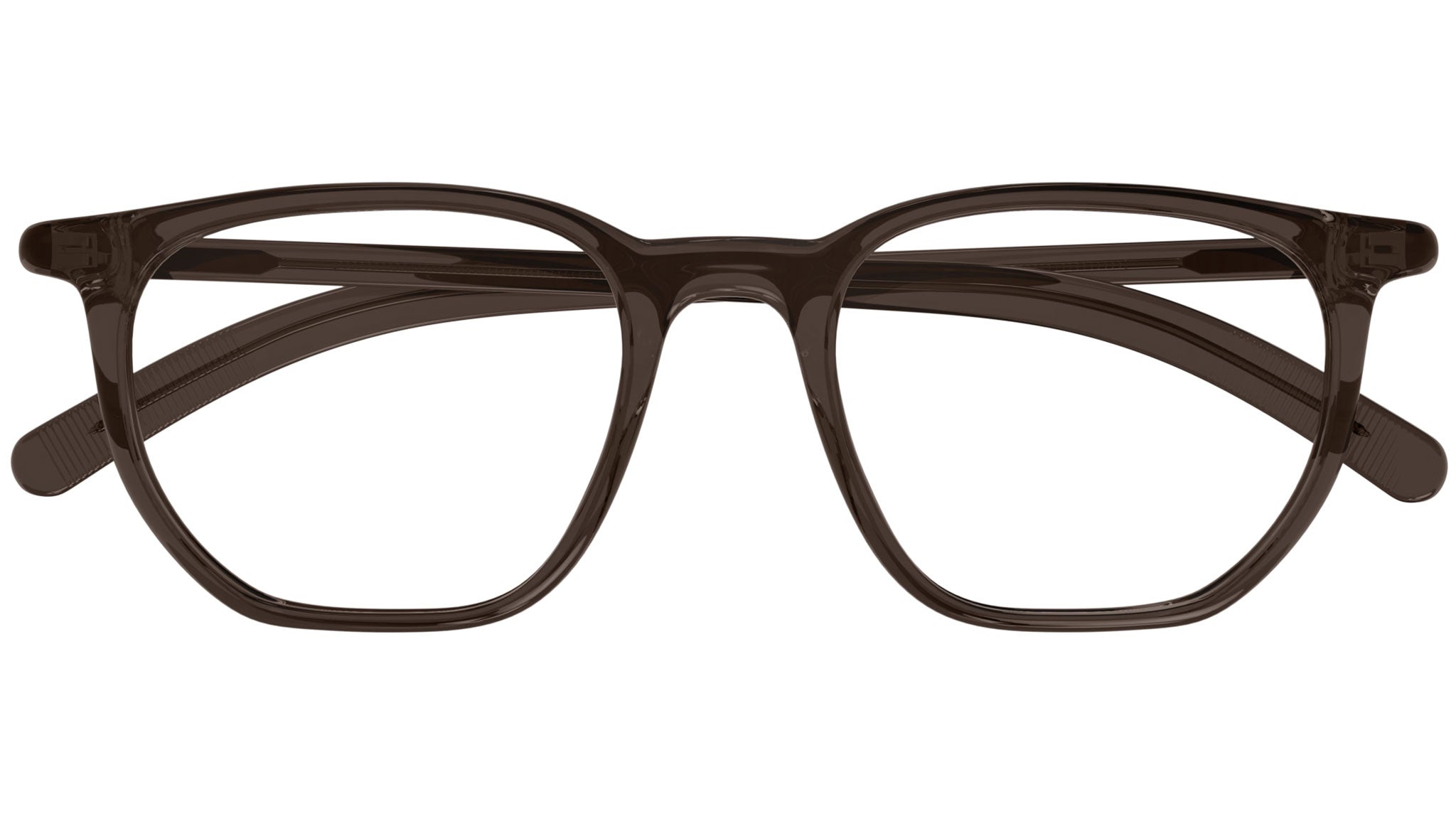 Occhiali da vista Montblanc Snowcap modello MB0349O in acetato iniettato riciclato rettangolare codice colore 002 marrone scuro trasparente lucido con aste in marrone e lenti demo. Rivenditore autorizzato Montblanc online. Gli occhiali vengono consegnati con custodia e accessori originali e sono coperti dalla garanzia ufficiale di 12 mesi del produttore.