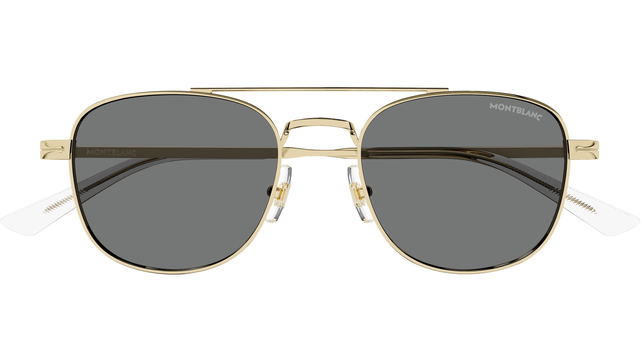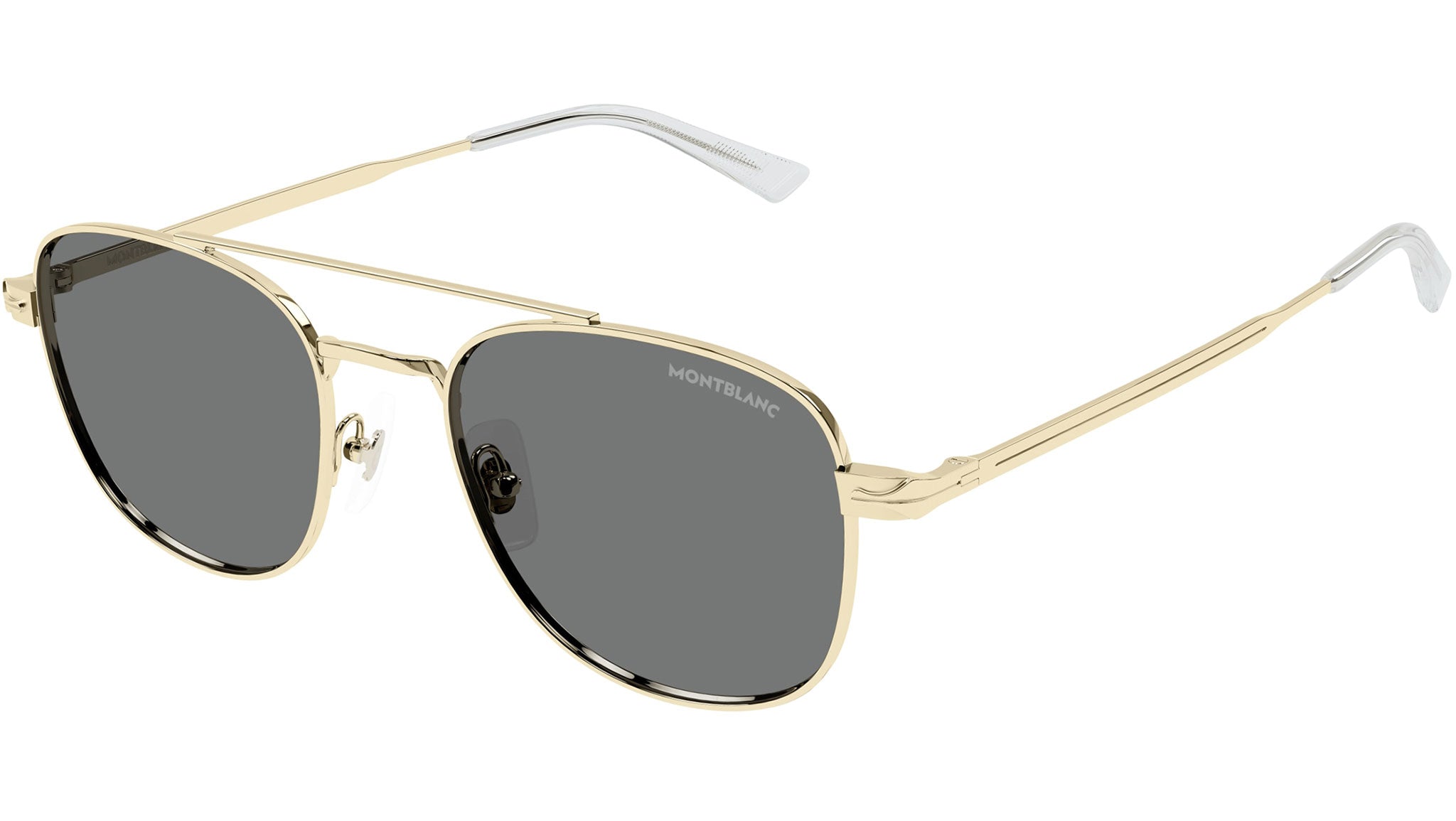 Occhiali da sole Montblanc Nib modello MB0363S in metallo aviatore, codice colore 001 oro chiaro lucido con aste in oro e lenti color grigio tinta unita. Rivenditore autorizzato Montblanc online. Gli occhiali vengono consegnati con custodia e accessori originali e sono coperti dalla garanzia ufficiale di 12 mesi del produttore.