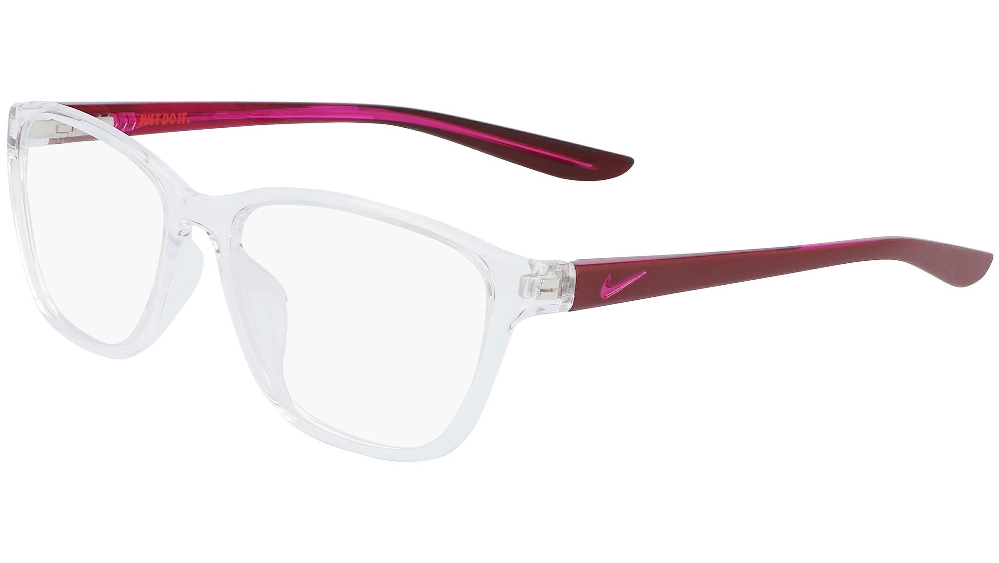 Nike Optical 5028 model featuring clear frame and shiny crystal cactus flower and white fade temple. Made with bio-based, injected plastic that minimizes environmental impact while adding durability and lightness to the frame.
