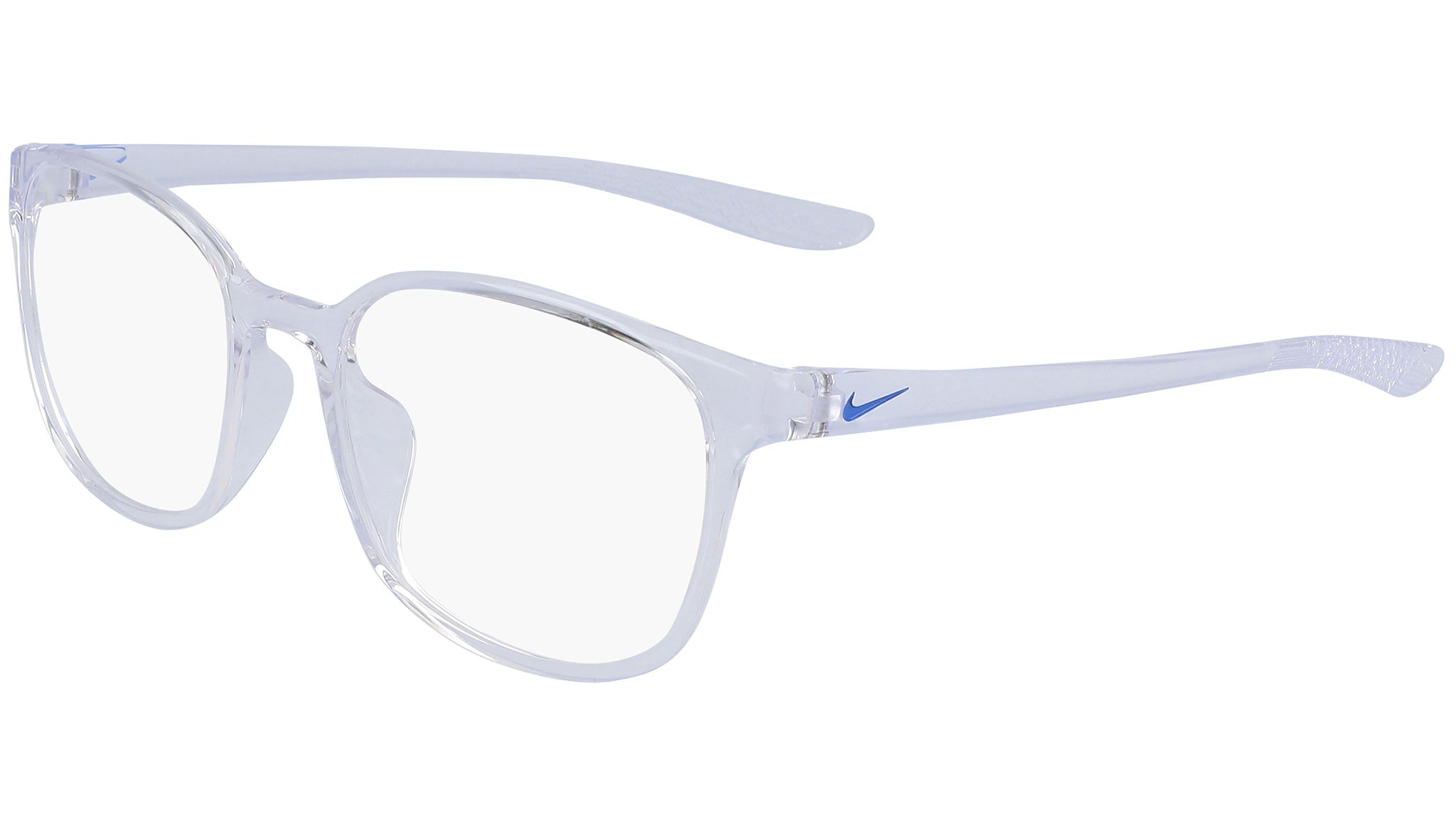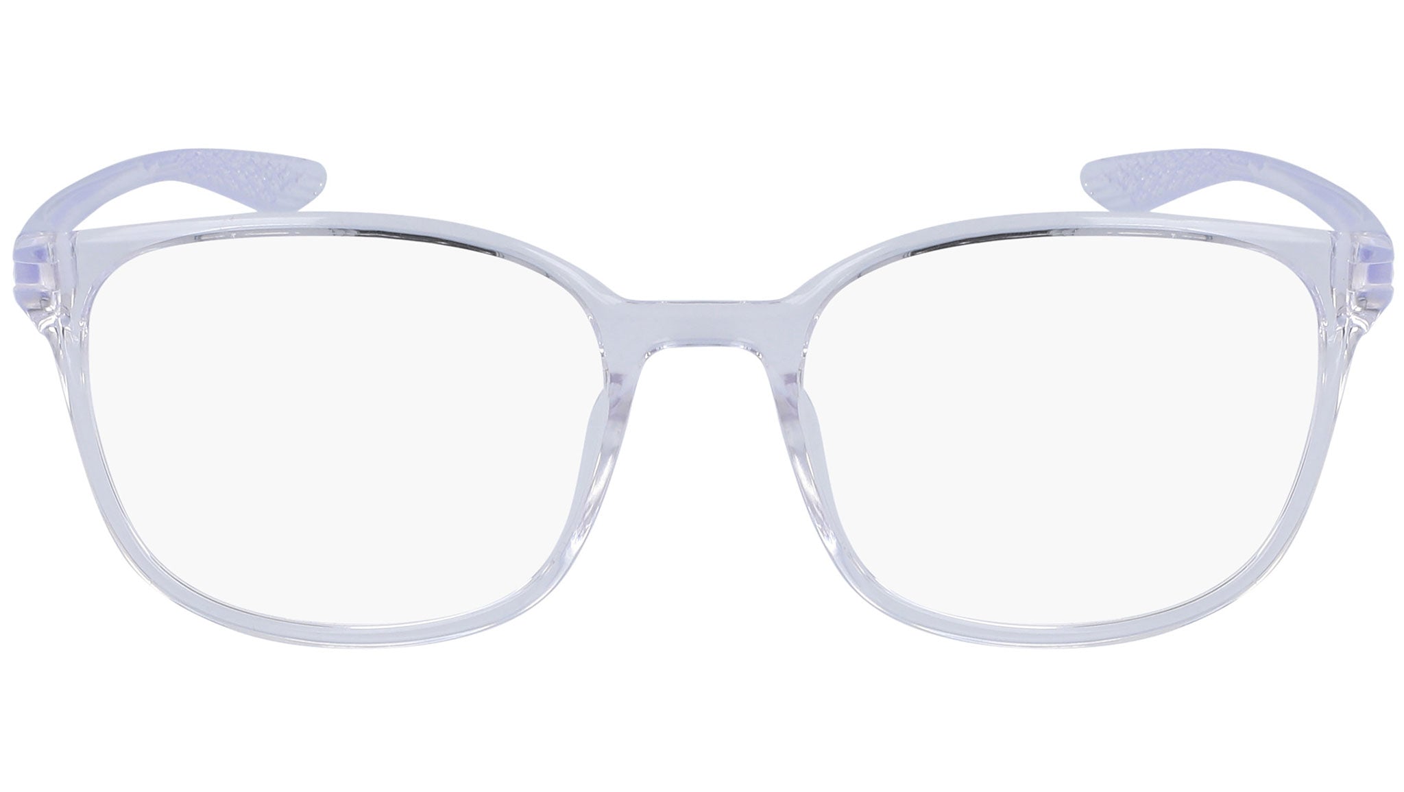 Nike Optical 7026 model featuring shiny crystal clear frame and shiny crystal clear temple. Made with bio-based, injected plastic that minimizes environmental impact while adding durability and lightness to the frame.