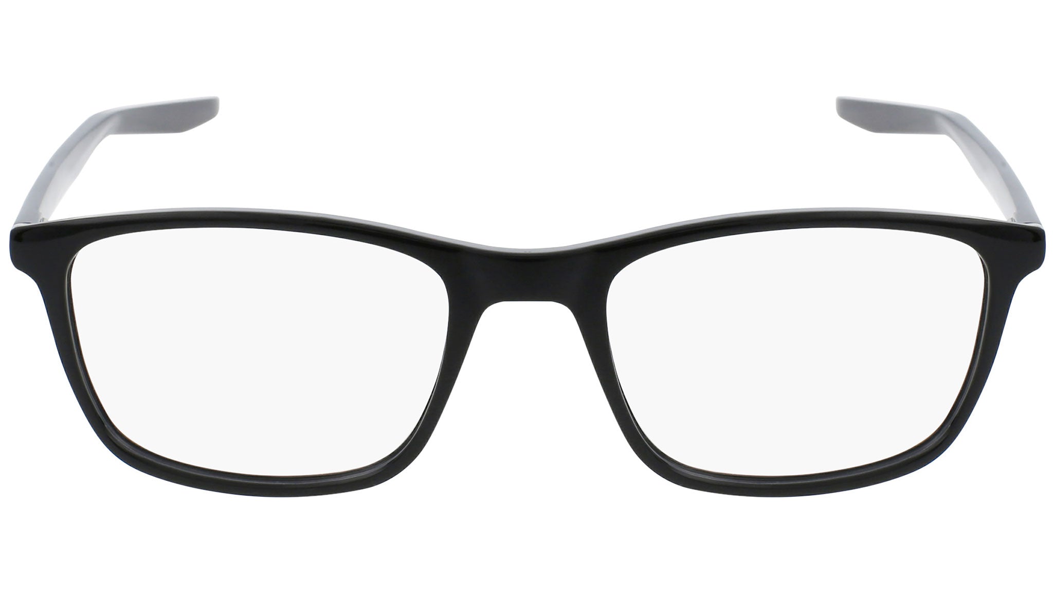 Nike Optical 7129 model featuring shiny solid black frame and shiny solid black temple. Made with bio-based, injected plastic that minimizes environmental impact while adding durability and lightness to the frame.