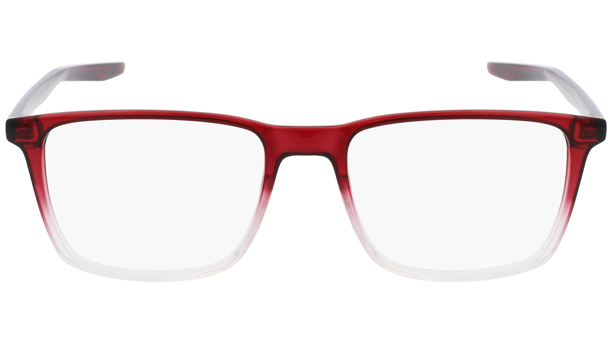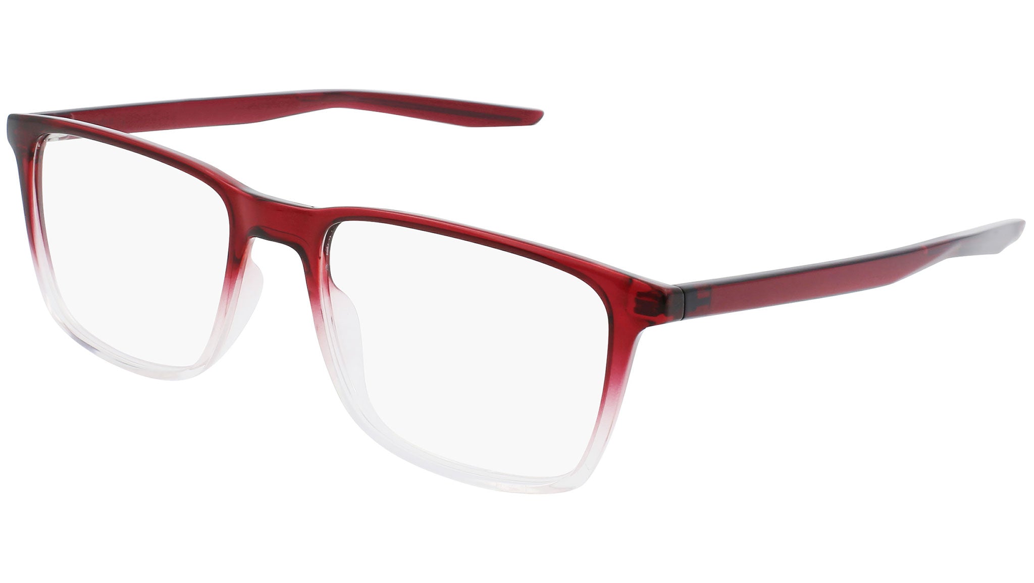 Nike Optical 7130 model featuring shiny crystal dark beetroot to clear bottom frame and shiny crystal dark beetroot temple. Made with bio-based, injected plastic that minimizes environmental impact while adding durability and lightness to the frame.