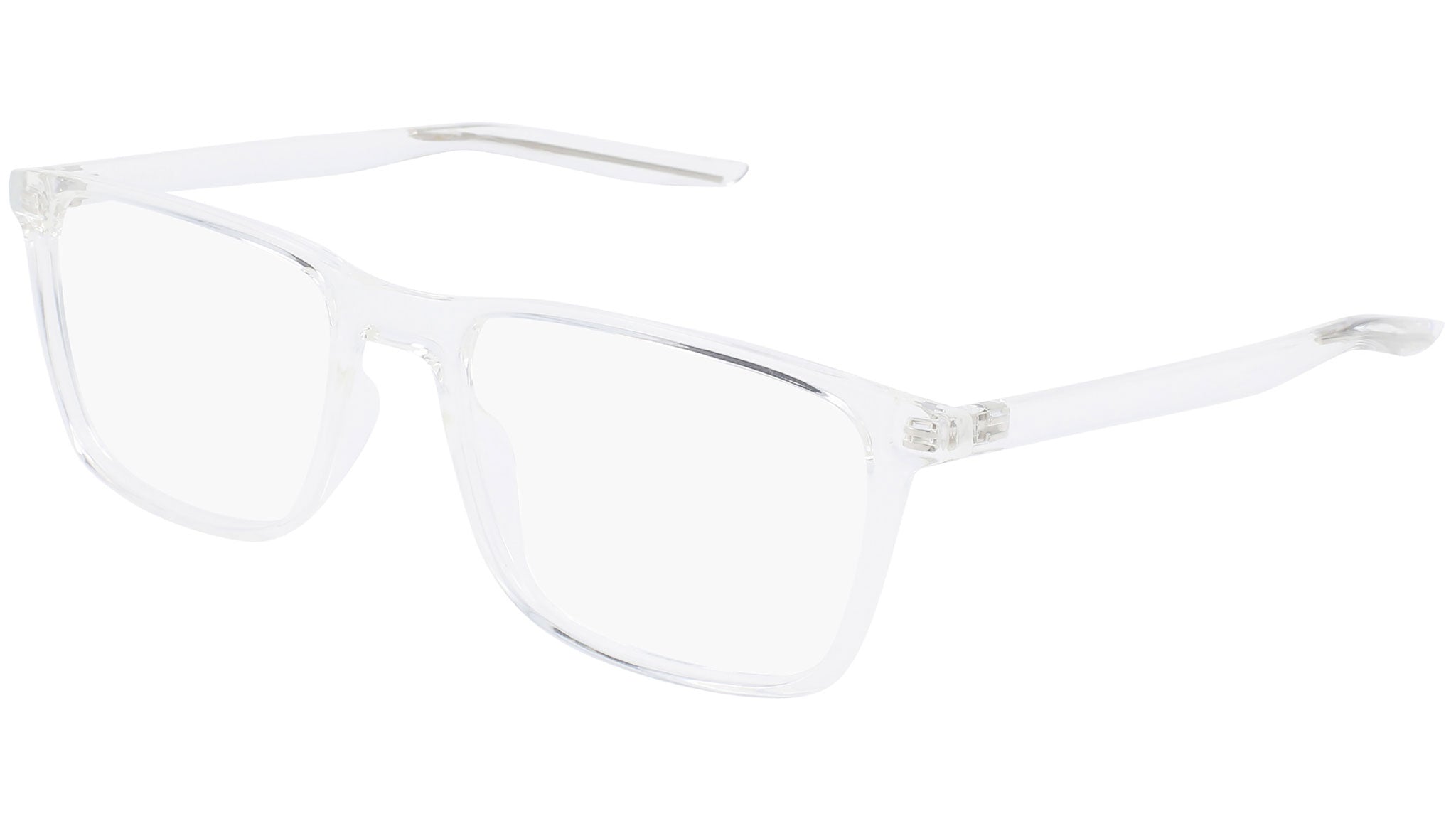 Nike Optical 7130 model featuring shiny crystal clear frame and shiny crystal clear temple. Made with bio-based, injected plastic that minimizes environmental impact while adding durability and lightness to the frame.