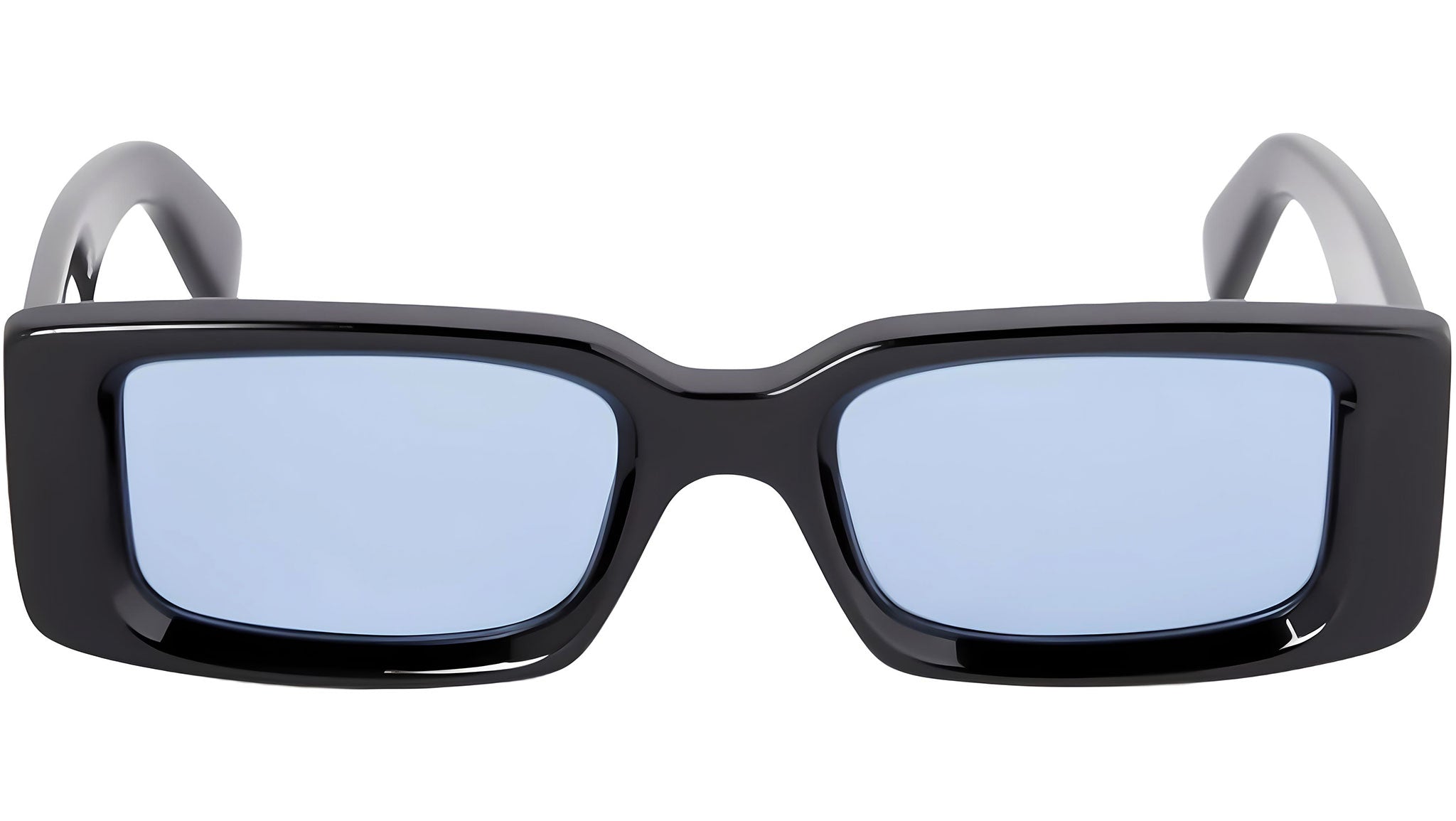 Occhiali da sole Off-White modello Arthur codice colore 1040 con frontale in acetato nero e lenti cat. 2 in polimero CR-39 azzurro. Rivenditore autorizzato Off-White Eyewear online. Gli occhiali vengono consegnati con custodia e accessori originali e sono coperti dalla garanzia ufficiale di 12 mesi del produttore.