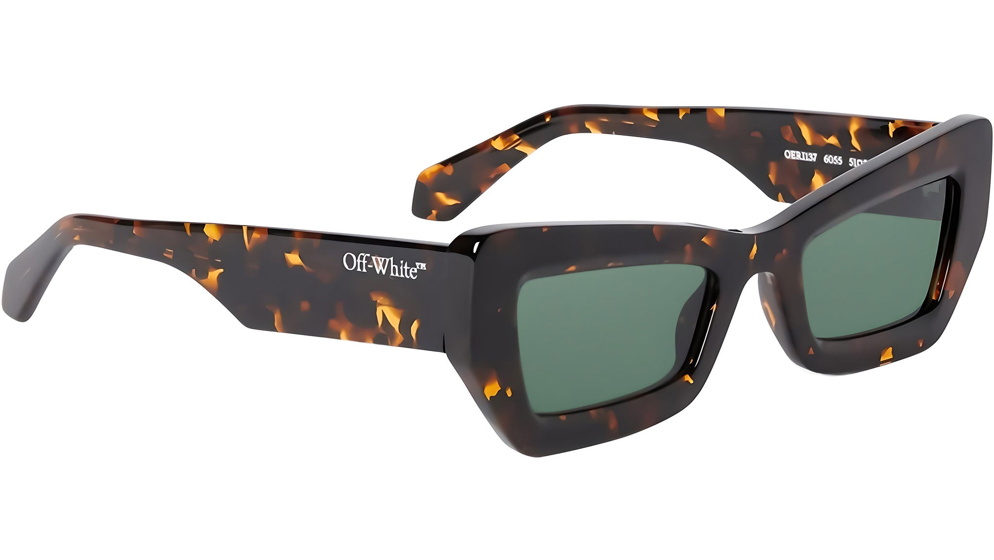 Occhiali da sole Off-White modello Aurora codice colore 6055 con frontale in acetato avana intenso e lenti cat. 3 in polimero CR-39 verde. Rivenditore autorizzato Off-White Eyewear online. Gli occhiali vengono consegnati con custodia e accessori originali e sono coperti dalla garanzia ufficiale di 12 mesi del produttore.