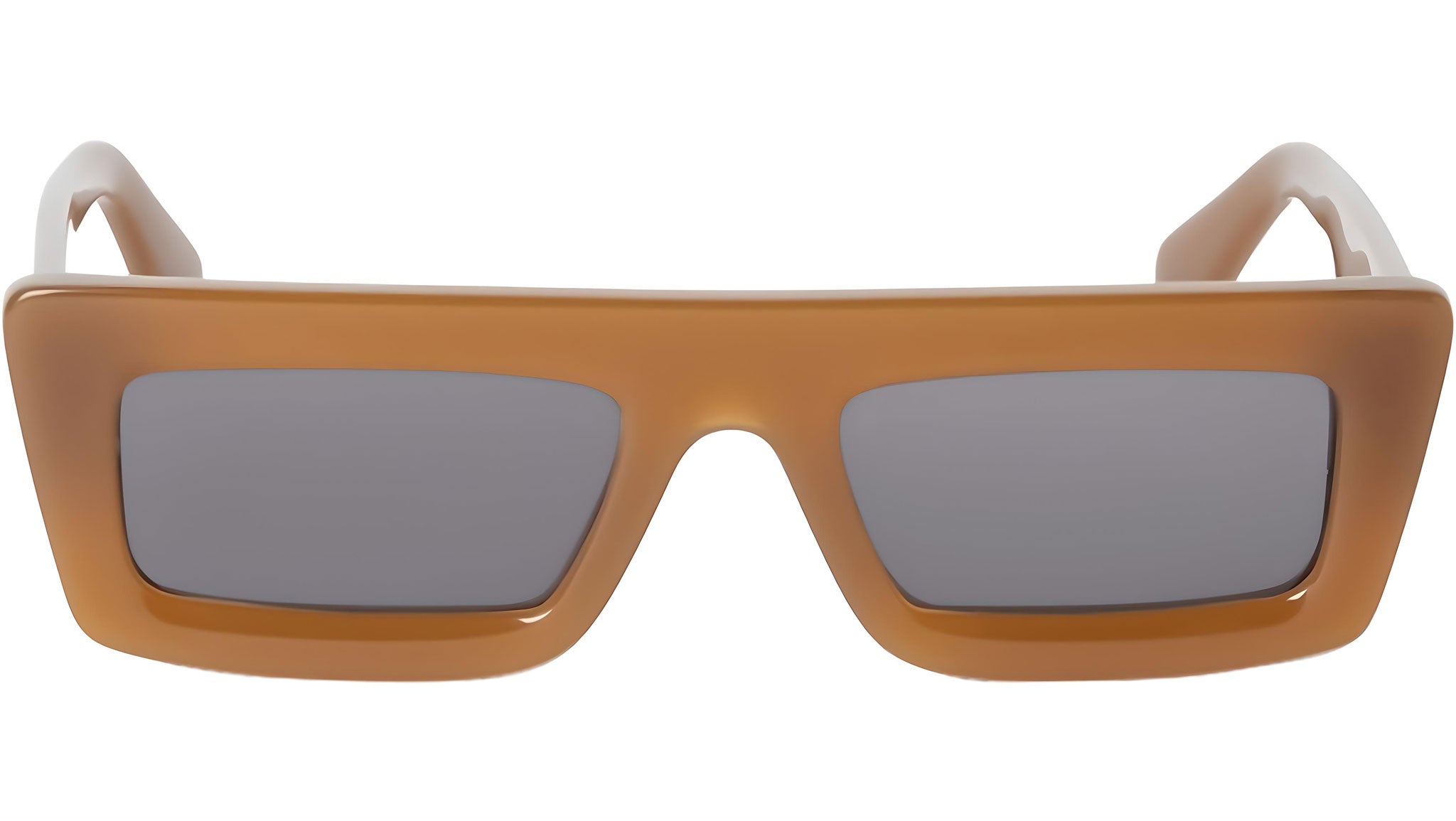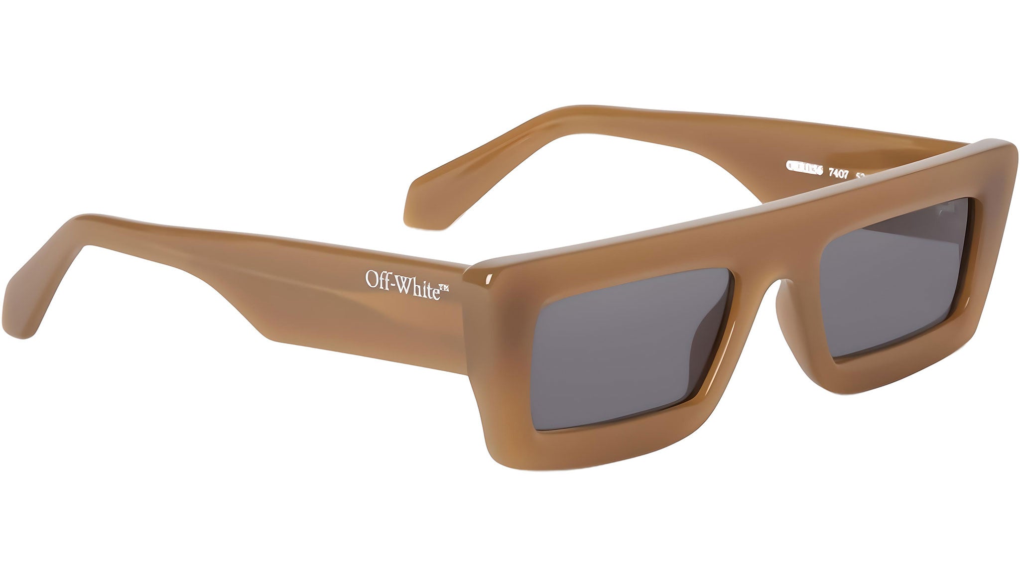 Occhiali da sole Off-White modello Ontario codice colore 7407 con frontale in acetato marrone fango lattiginoso e lenti cat. 3 in polimero CR-39 grigio scuro. Rivenditore autorizzato Off-White Eyewear online. Gli occhiali vengono consegnati con custodia e accessori originali e sono coperti dalla garanzia ufficiale di 12 mesi del produttore.