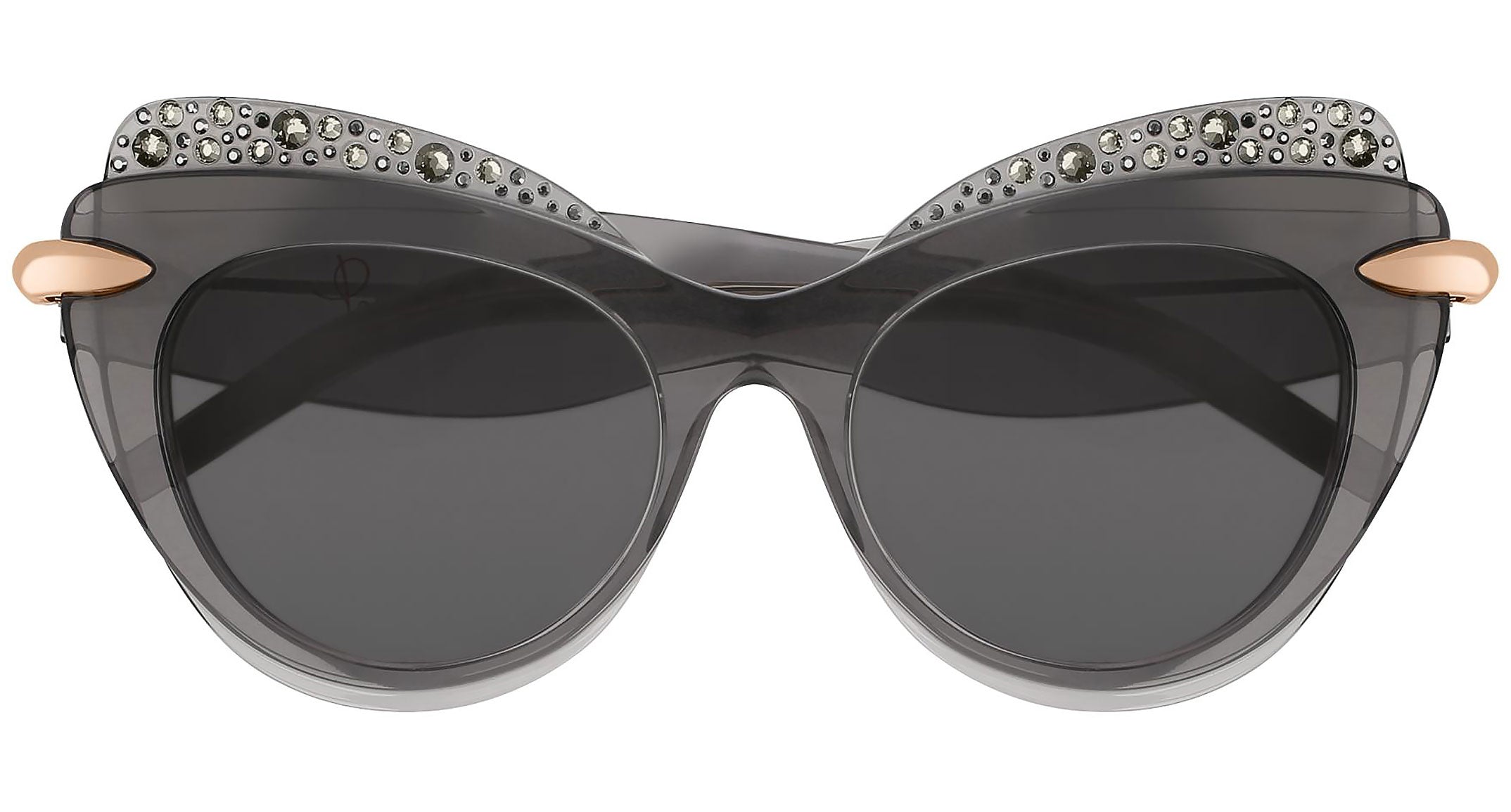 Pomellato sunglasses collection model PM0002S 007 featuring shiny dark transparent grey/light grey frame and smoke lens. The eyewear collection reflects the iconic, colorful and unconventional aesthetic of Pomellato, reinterpreting its voluptuous shapes and precious features in a covetable selection poised on the flawless balance between artisanal precision and timeless elegance.