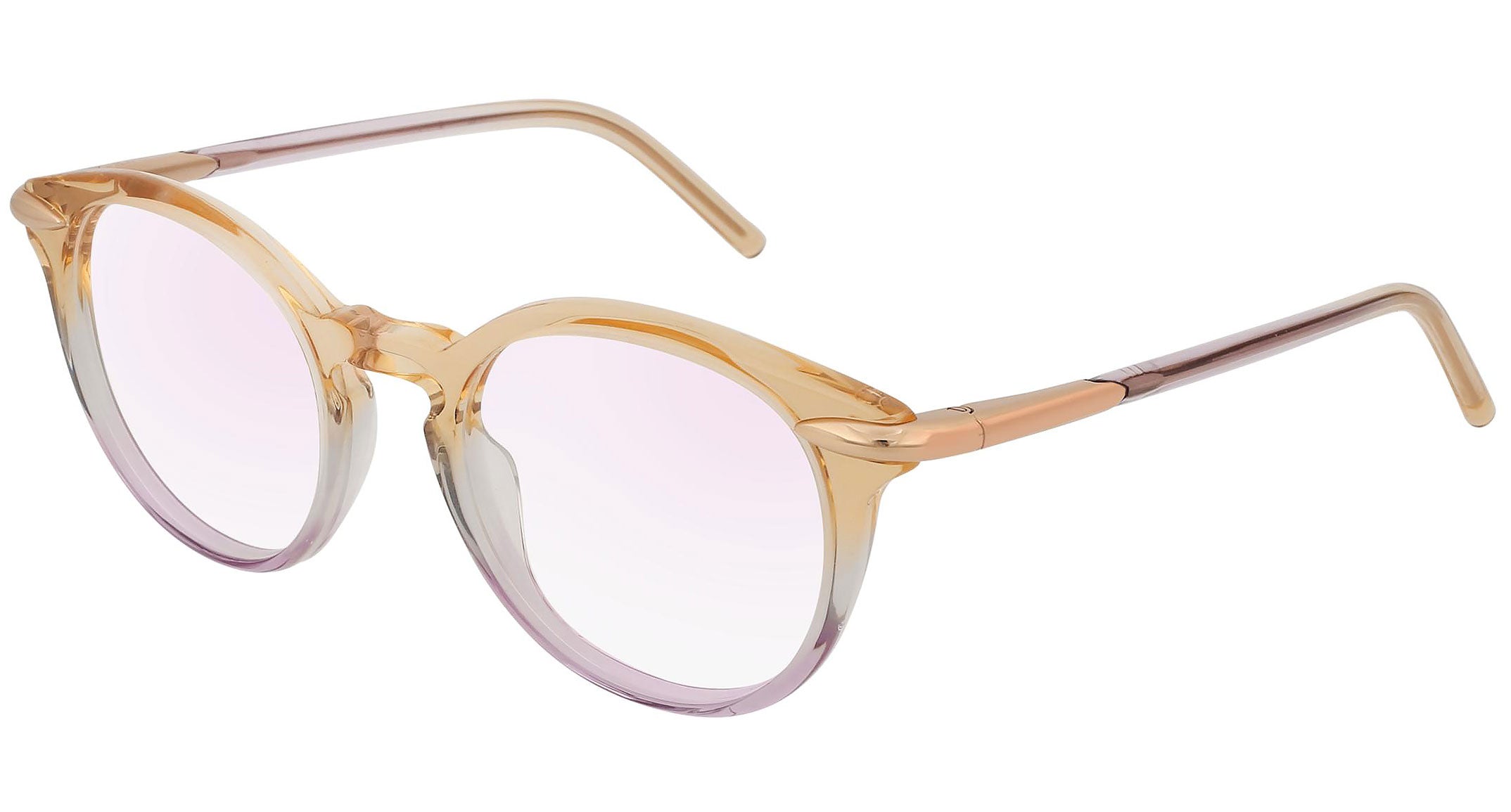 Pomellato Eyewear model PM0038O 004 featuring shiny gradient transparet yellow/grey/violet frame and multicolor temple. The eyewear collection reflects the iconic, colorful and unconventional aesthetic of Pomellato, reinterpreting its voluptuous shapes and precious features in a covetable selection poised on the flawless balance between artisanal precision and timeless elegance.