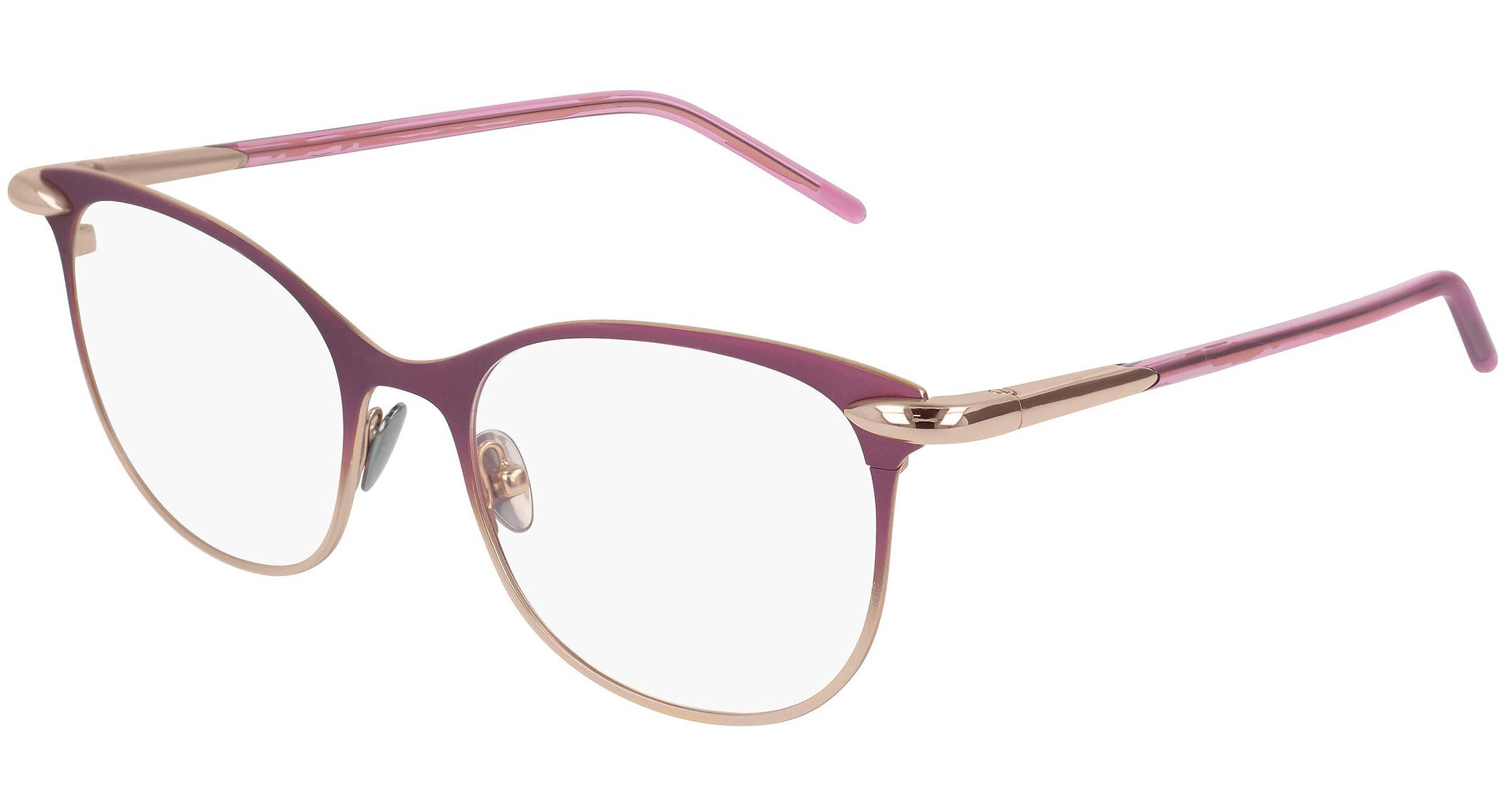 Pomellato Eyewear model PM0054O 003 featuring semimatte gradient cyclamen/semimatte pink gold frame and gold temple. The eyewear collection reflects the iconic, colorful and unconventional aesthetic of Pomellato, reinterpreting its voluptuous shapes and precious features in a covetable selection poised on the flawless balance between artisanal precision and timeless elegance.