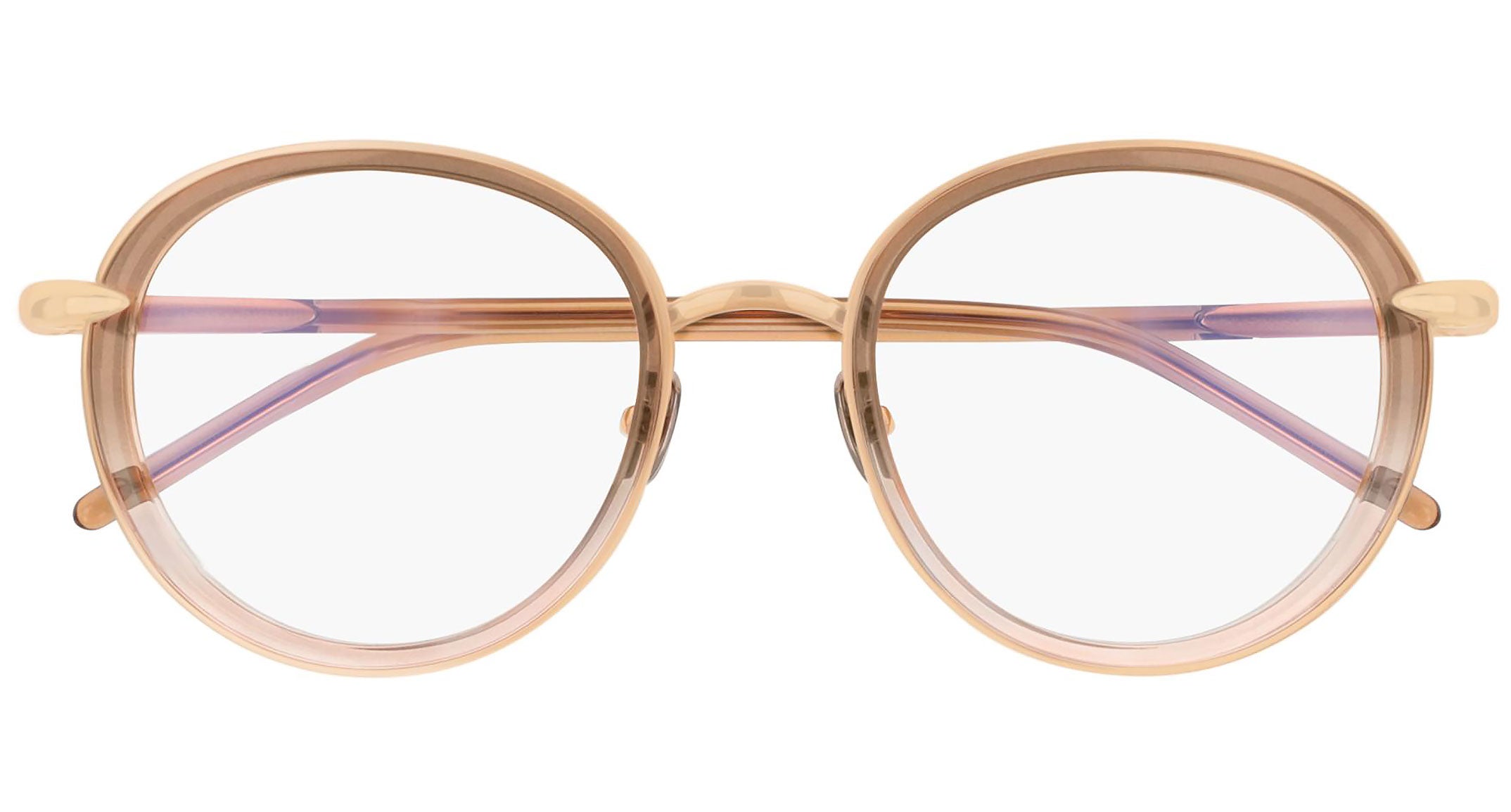 Pomellato Eyewear model PM0059O 002 featuring shiny pink gold/shiny gradient transparent iridescent brown/nude frame and brown temple. The eyewear collection reflects the iconic, colorful and unconventional aesthetic of Pomellato, reinterpreting its voluptuous shapes and precious features in a covetable selection poised on the flawless balance between artisanal precision and timeless elegance.