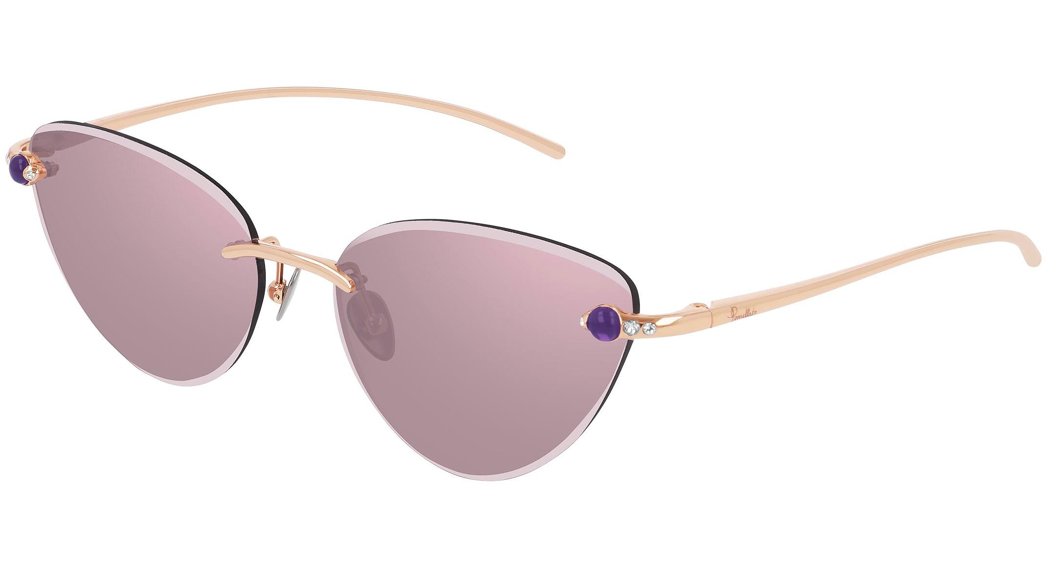 Pomellato sunglasses collection model PM0068S 006 featuring shiny pink gold frame and pink lens. The eyewear collection reflects the iconic, colorful and unconventional aesthetic of Pomellato, reinterpreting its voluptuous shapes and precious features in a covetable selection poised on the flawless balance between artisanal precision and timeless elegance.