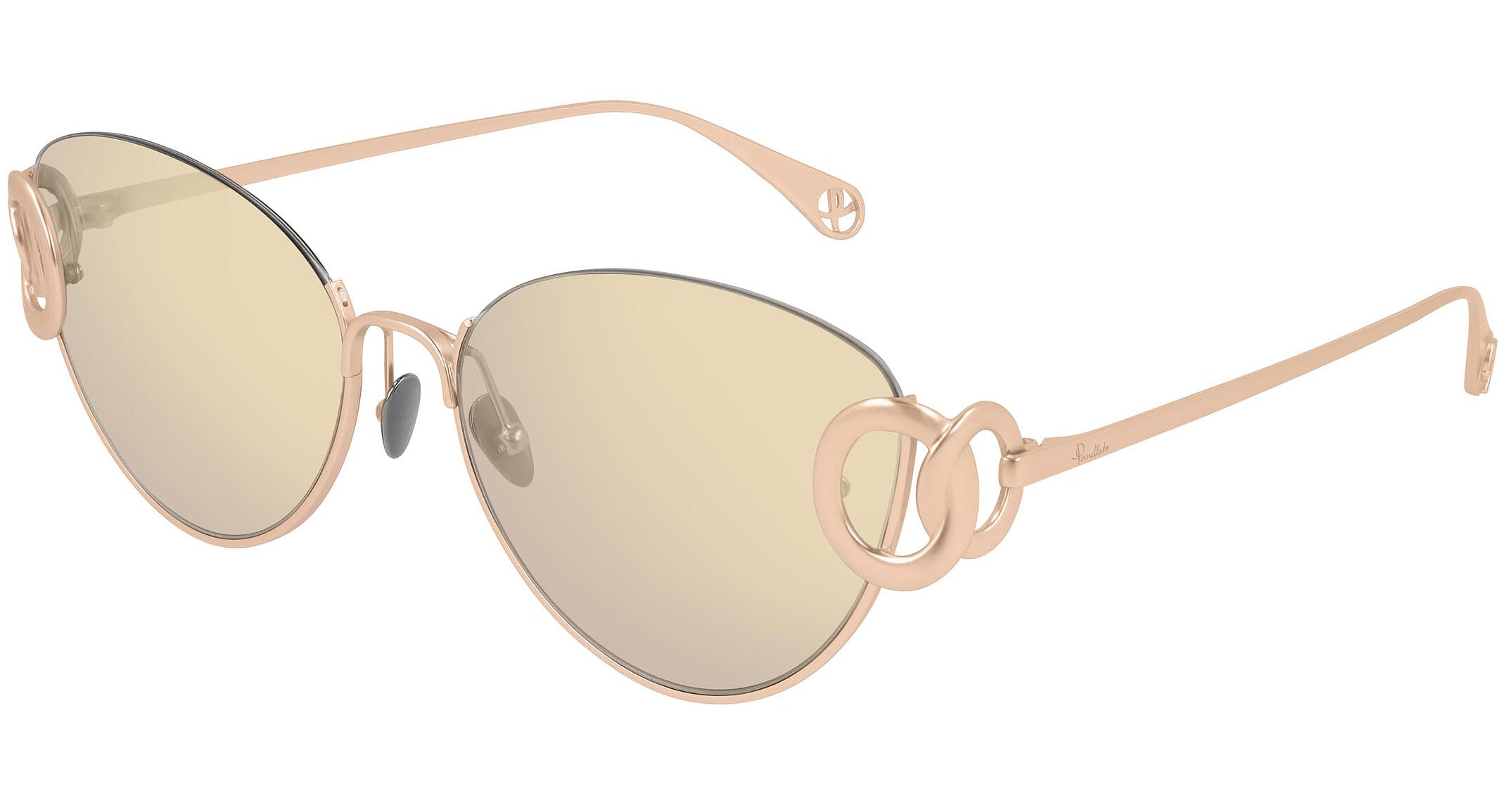 Pomellato sunglasses collection model PM0077S 003 featuring semimatte pink gold frame and brown lens. The eyewear collection reflects the iconic, colorful and unconventional aesthetic of Pomellato, reinterpreting its voluptuous shapes and precious features in a covetable selection poised on the flawless balance between artisanal precision and timeless elegance.
