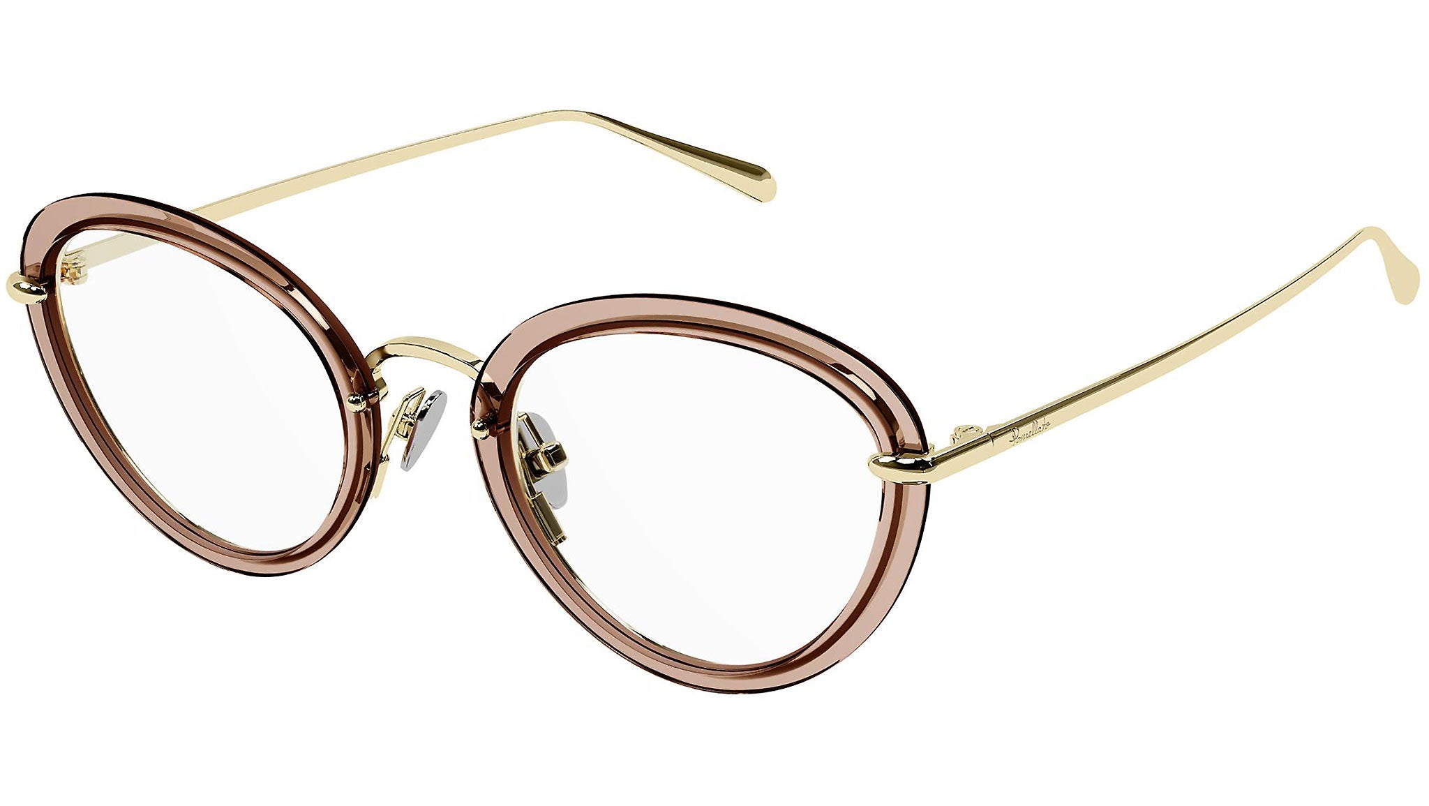 Occhiali da vista Pomellato modello 0107O, variante colore 003 oro chiaro lucido e marrone tinta unita con astine color oro.