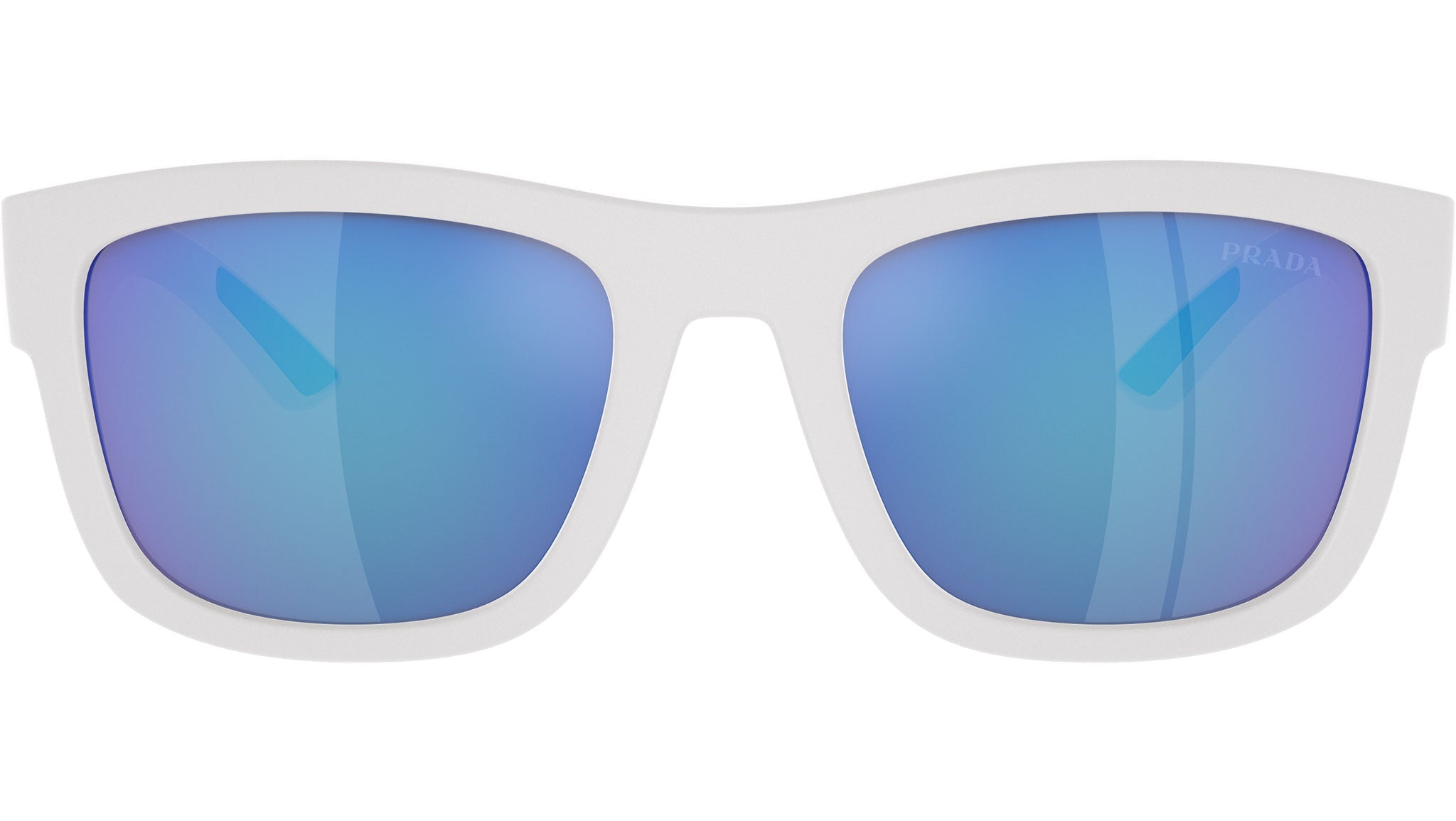 Occhiali da sole Prada Linea Rossa modello PS 01ZS codice colore TWK08R con montatura d-frame full rim in nylon color bianco gommato e lenti in poliammide color verde chiaro a specchio blu. Rivenditore autorizzato Prada. Ogni prodotto Prada Linea Rossa viene consegnato con astuccio originale e accessori.