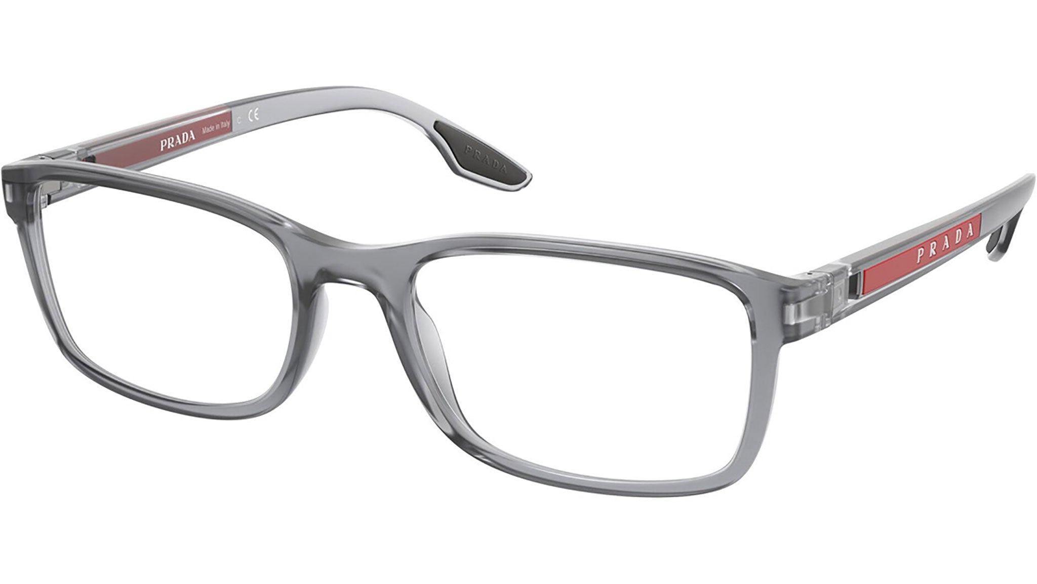 Occhiali da vista Prada Linea Rossa modello PS 09OV variante colore grigio trasparente, codice colore 14C1O1. Nuove prospettive, sintesi perfetta di abbigliamento sportivo e eleganza contemporanea: gli occhiali della collezione Prada Linea Rossa esprimono il più perfetto casual style con la migliore qualita arigianale e la cura dei dettagli propri della maison Prada.