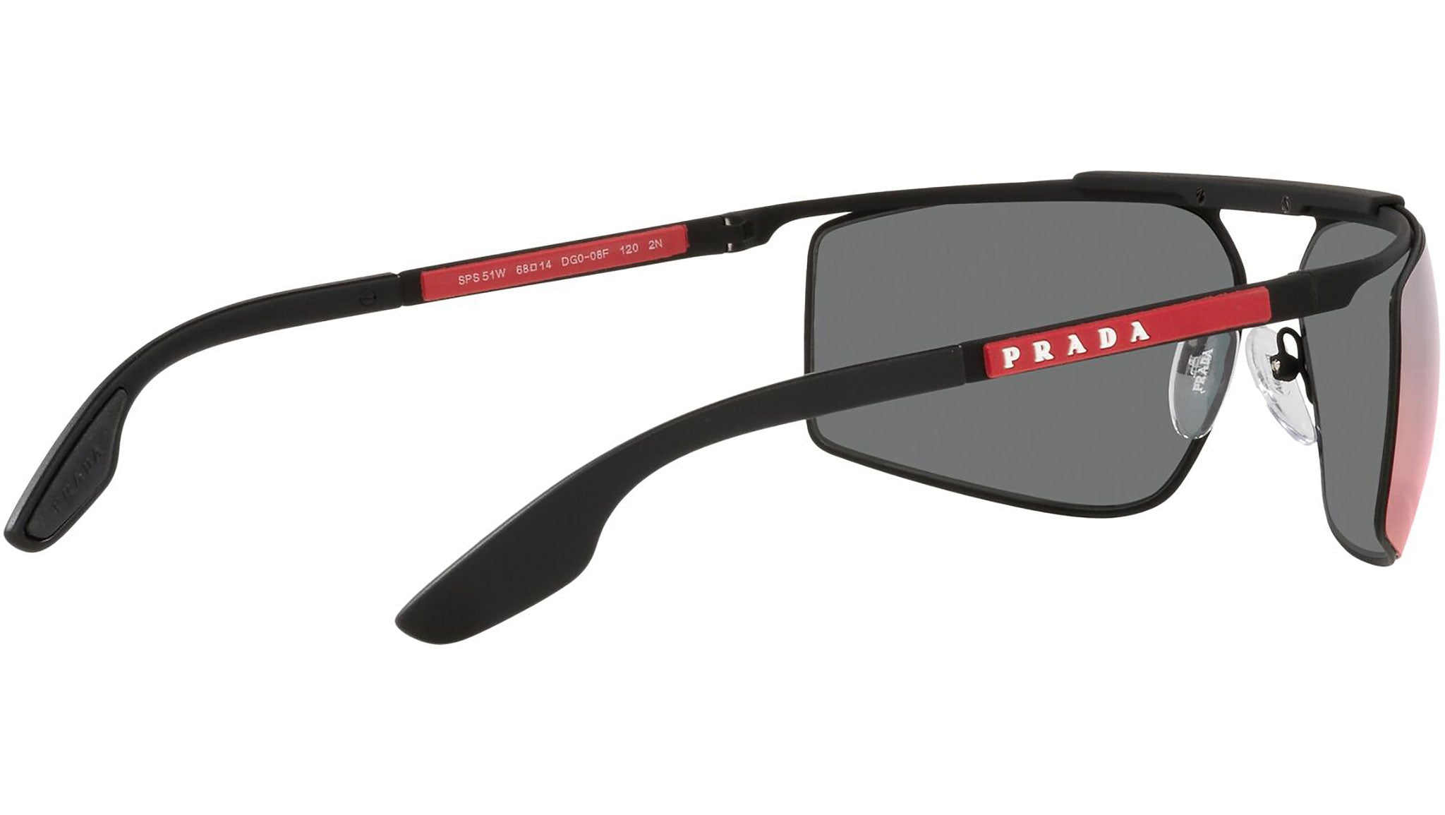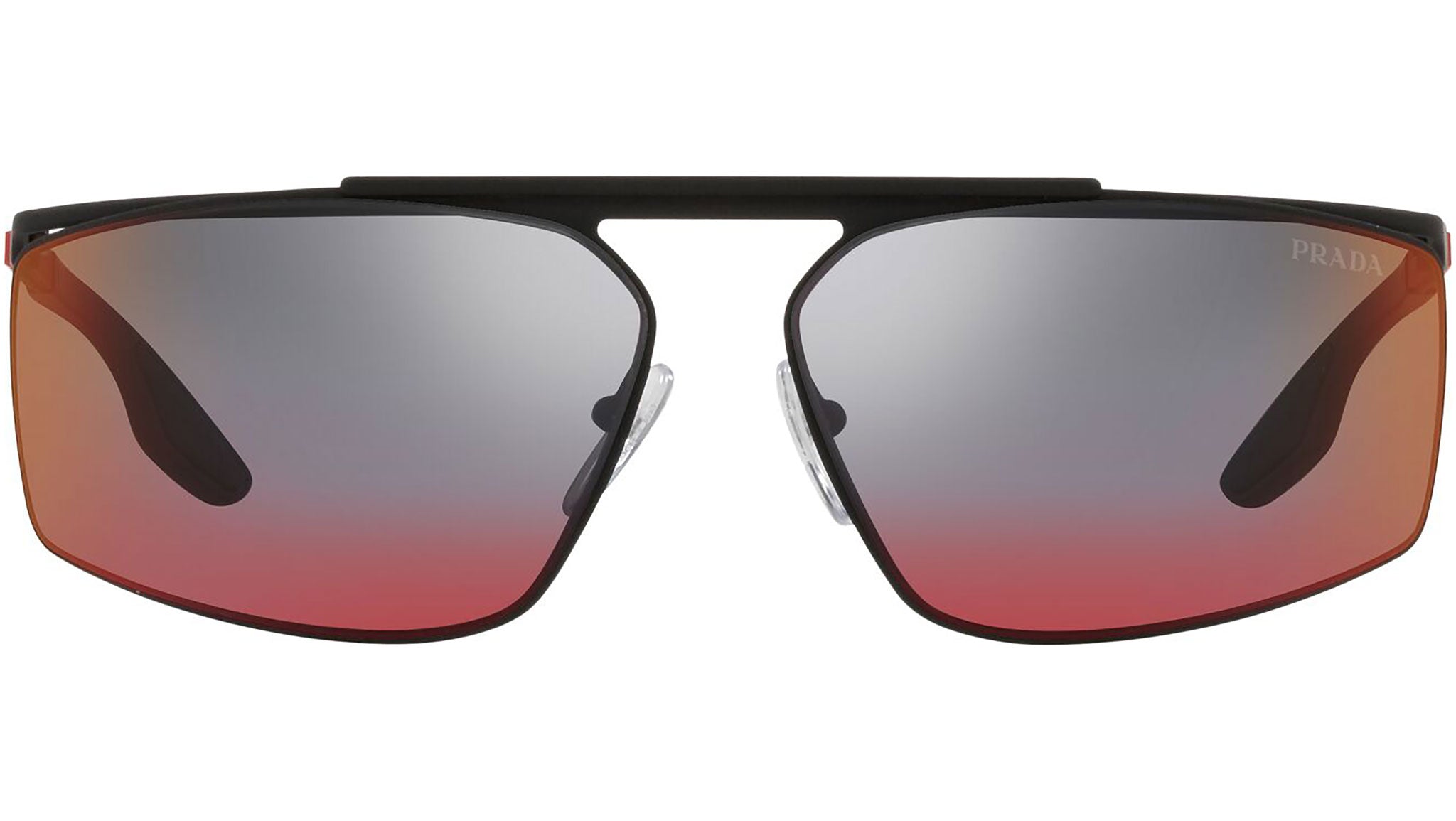 Occhiali da sole Prada Linea Rossa modello PS 51WS nella variante colore DG008F nero gomma con lenti color grigio scuro a specchio blu / rosso. Una perfetta fusione dei concetti di sportswear ed eleganza contemporanea: la linea di occhiali da sole Prada Linea Rossa declina in un moderno stile casual tutta la qualità e la raffinatezza artigianale della maison Prada.