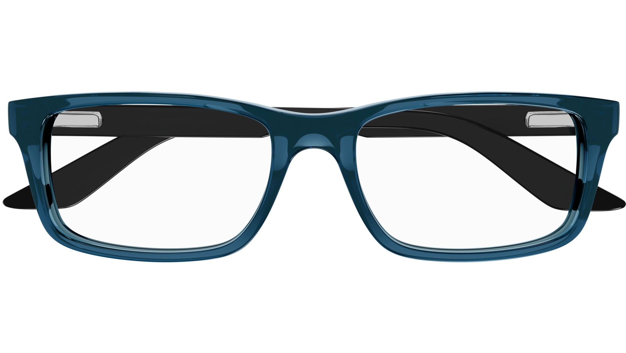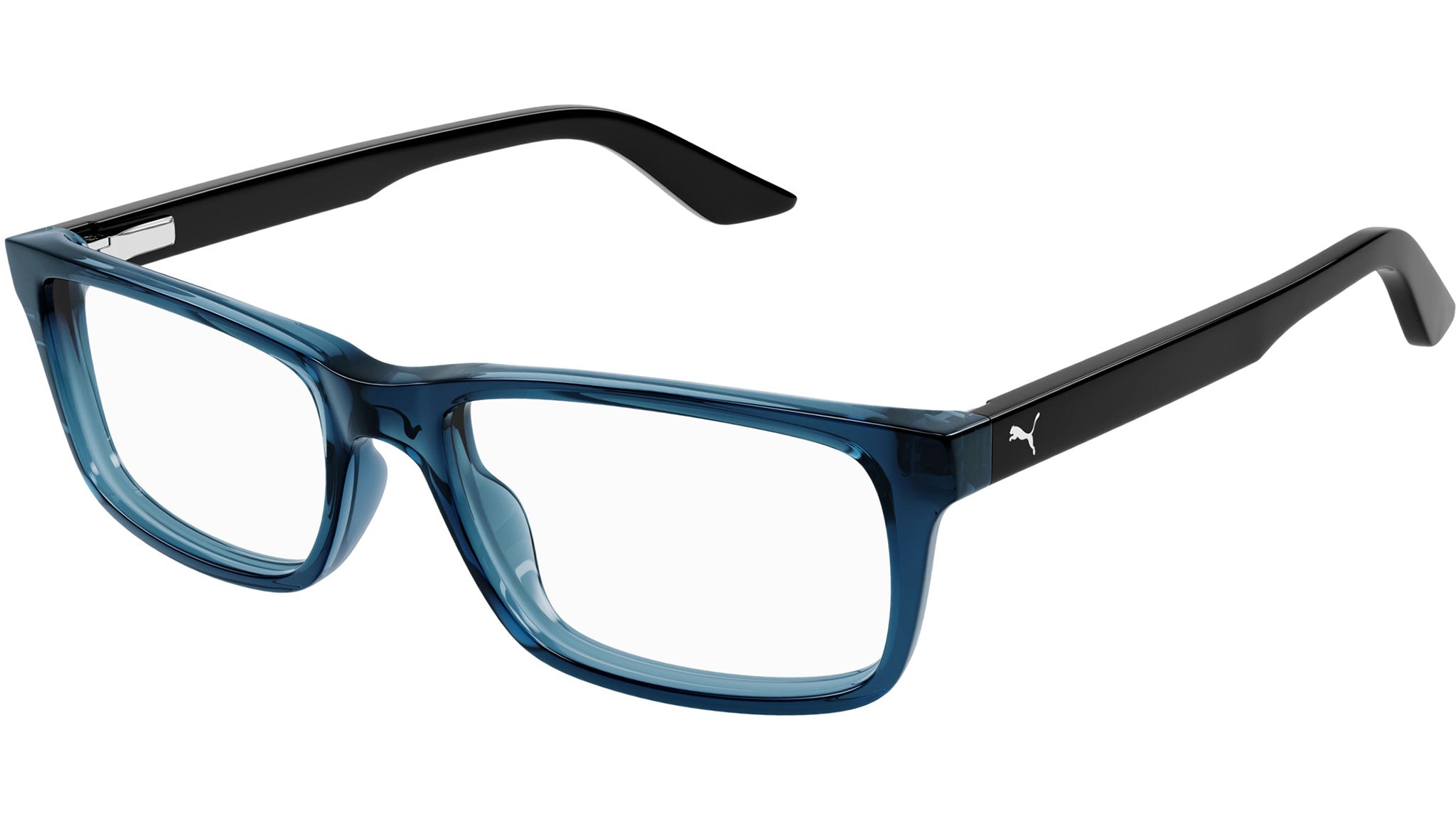 Occhiali da vista Puma Junior modello PJ0009O variante colore 009 blu di prussia traspatente lucido con lenti demo.