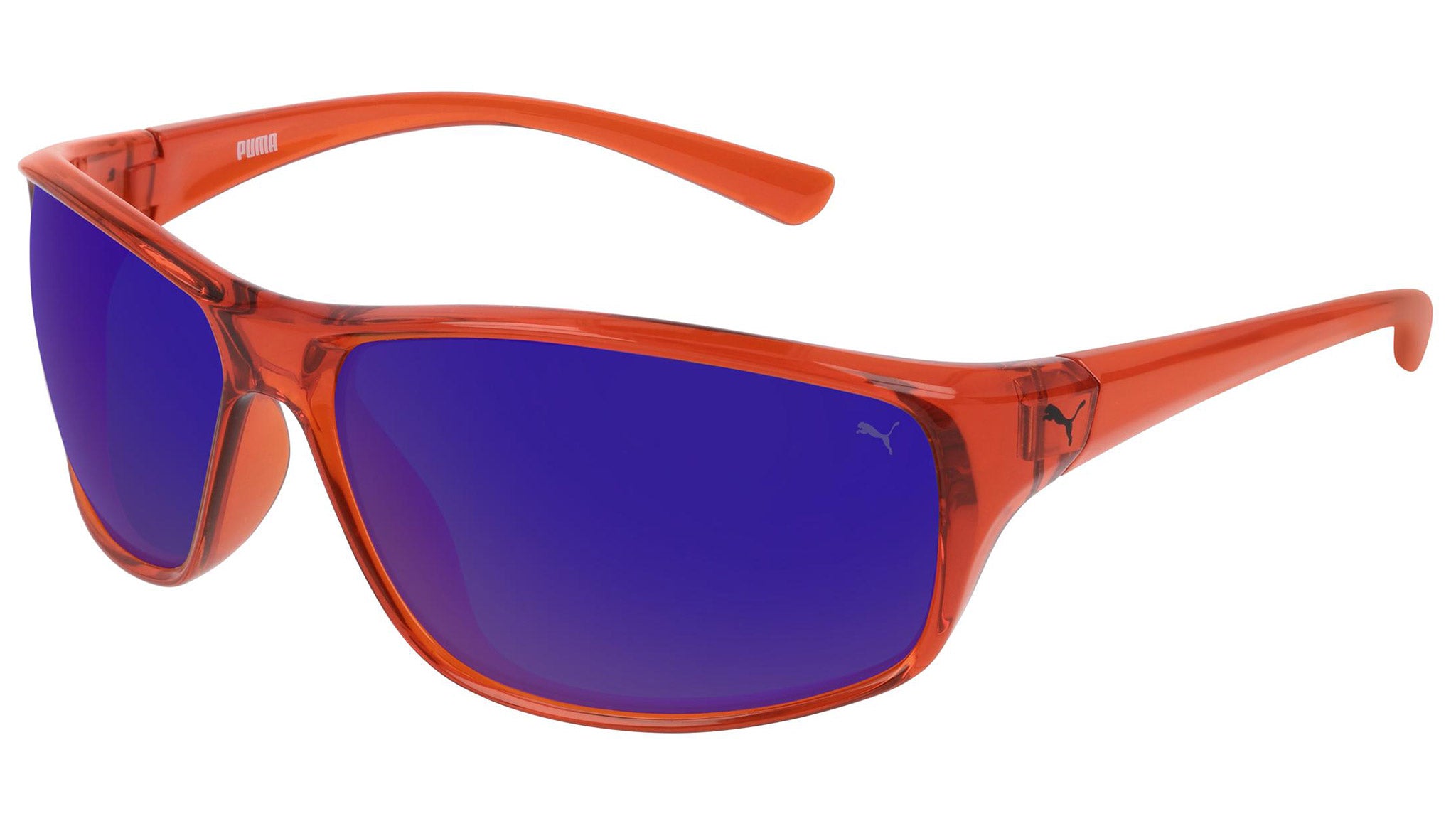 Puma Eyewear model PE0075S 003 shiny transparent red sunglasses, with blue lenses. Puma Eyewear merges performance and trends, innovation and fashion, sport and lifestyle, for those who see beyond trends and challenge the norm to move things forward.