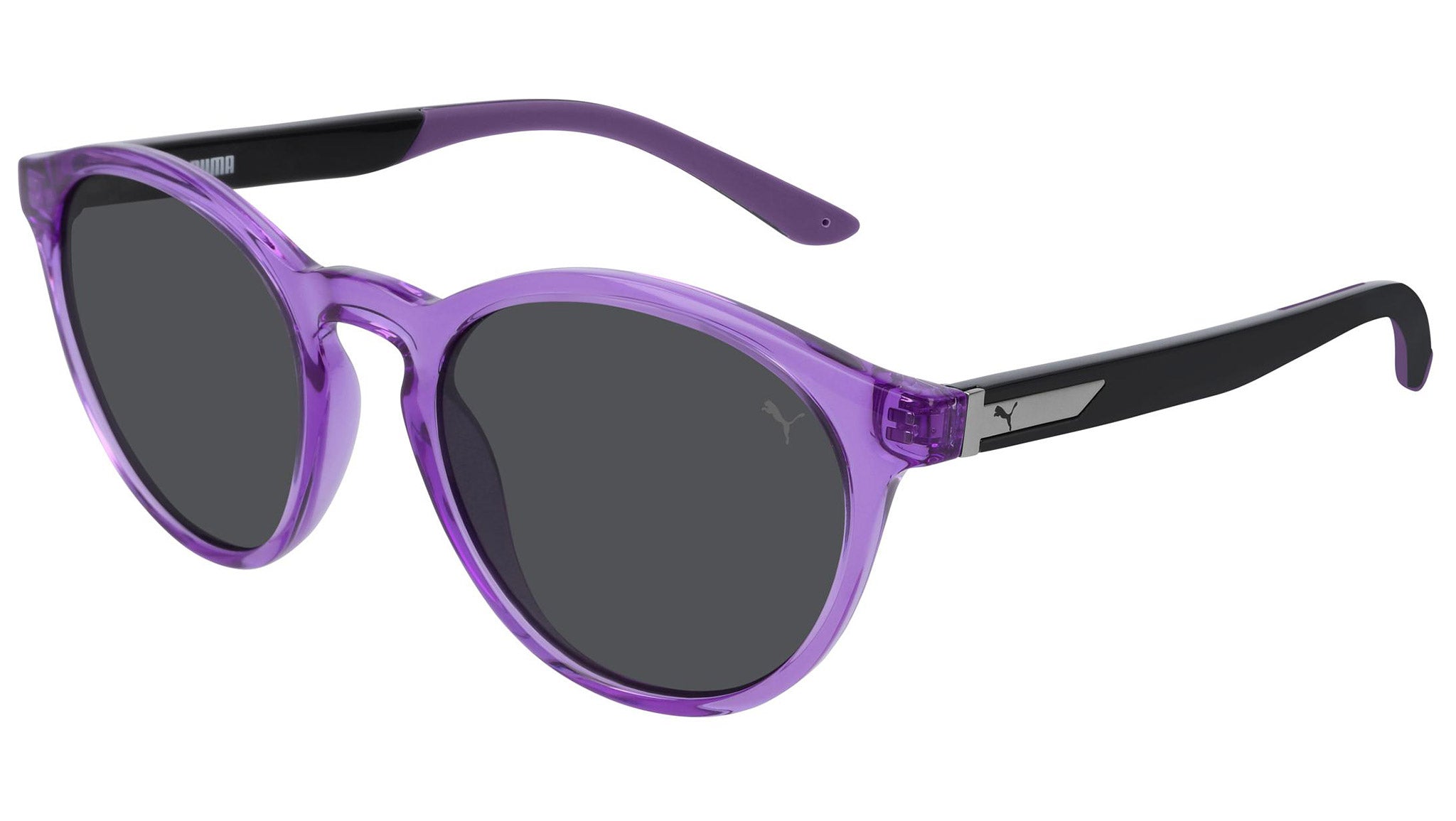 Puma Eyewear model PE0077S 002 shiny transparent fluo purple sunglasses, with grey lenses. Puma Eyewear merges performance and trends, innovation and fashion, sport and lifestyle, for those who see beyond trends and challenge the norm to move things forward.