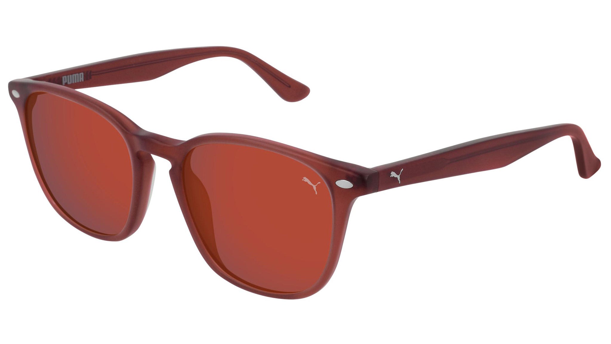 Puma Eyewear model PE0079S 004 matte transparent burgundy sunglasses, with orange lenses. Puma Eyewear merges performance and trends, innovation and fashion, sport and lifestyle, for those who see beyond trends and challenge the norm to move things forward.