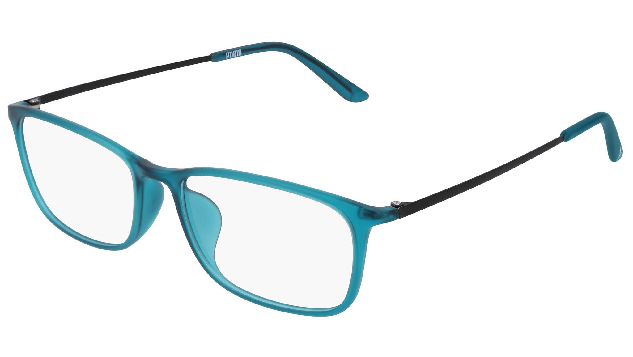 Puma Eyewear model PE0086O 003 matte transparent petrol optical frame. Designed to fit the movers and the shakers, who seek a dynamic lifestyle. Puma Eyewear is for the hustler, the bold and the Active, for those who see beyond trends and challenge the norm to move things forward.