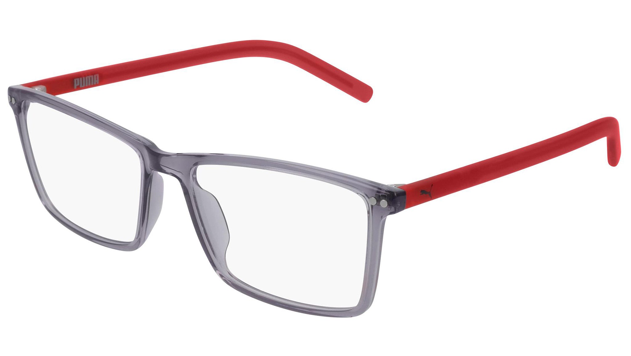 Puma Eyewear model PE0087O 004 shiny transparent grey optical frame. Designed to fit the movers and the shakers, who seek a dynamic lifestyle. Puma Eyewear is for the hustler, the bold and the Active, for those who see beyond trends and challenge the norm to move things forward.