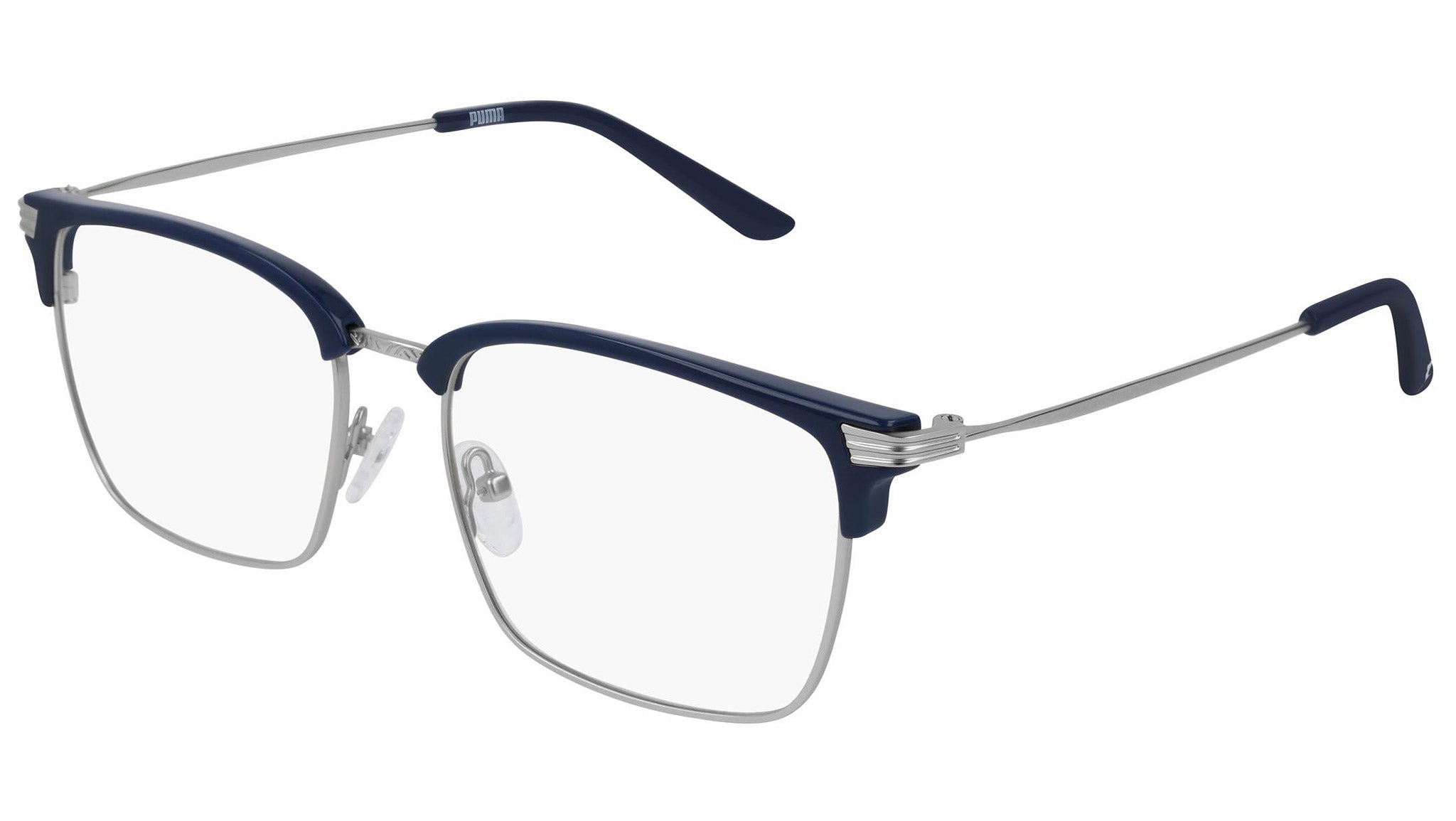 Puma Eyewear model PE0089O 003 shiny solid blue and matte silver optical frame. Designed to fit the movers and the shakers, who seek a dynamic lifestyle. Puma Eyewear is for the hustler, the bold and the Active, for those who see beyond trends and challenge the norm to move things forward.