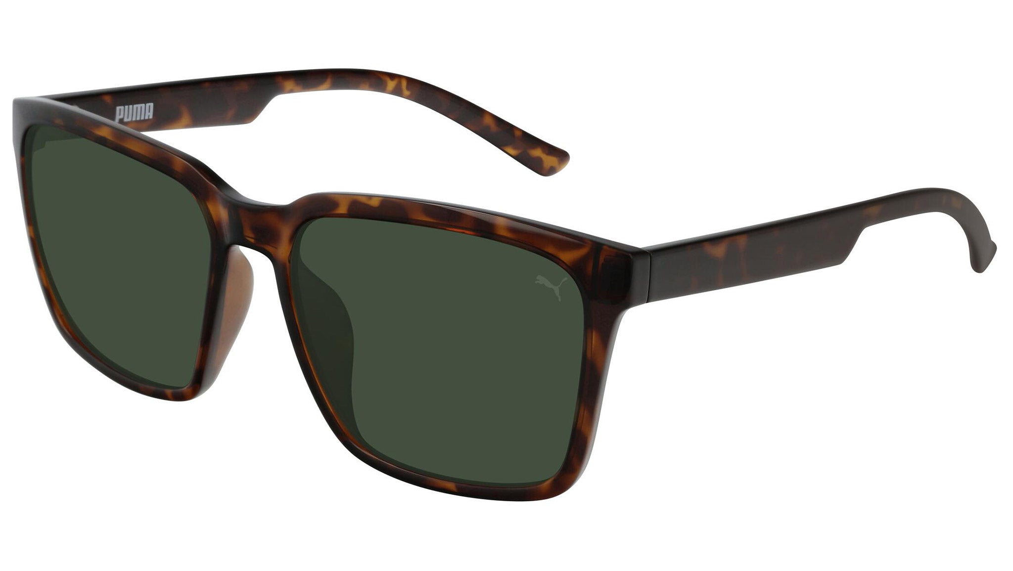 Puma Eyewear model PE0095S 003 shiny dark havana sunglasses, with green lenses. Puma Eyewear merges performance and trends, innovation and fashion, sport and lifestyle, for those who see beyond trends and challenge the norm to move things forward.