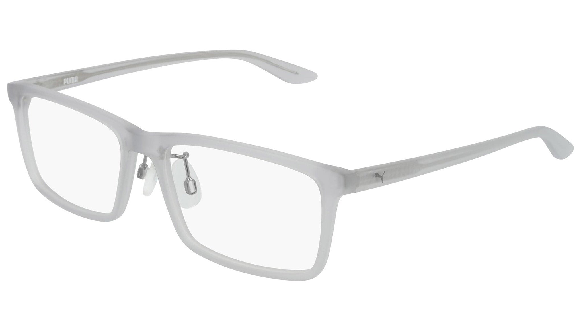 Puma Eyewear model PE0104O 004 matte transparent light grey optical frame. Designed to fit the movers and the shakers, who seek a dynamic lifestyle. Puma Eyewear is for the hustler, the bold and the Active, for those who see beyond trends and challenge the norm to move things forward.