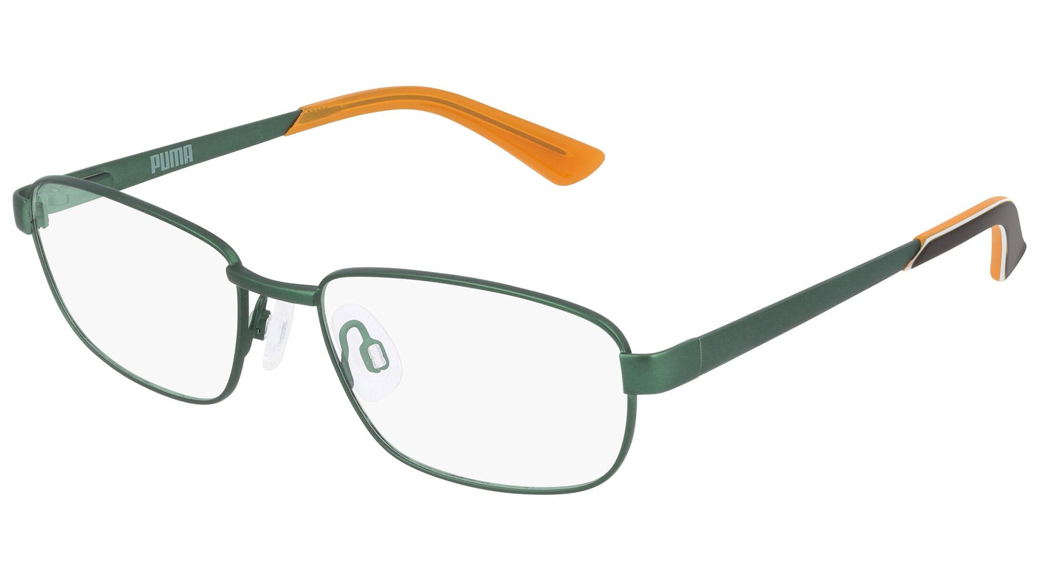 Puma for Kids model PJ0011O 008 matte transparent varnished military green optical frame. These kids are on the move. They roam the streets in search for recognition, emotions and daily kicks: celebrating with friends at the Luna Park, a thrilling jump, a trick on a skateboard, or simply seeing something new.