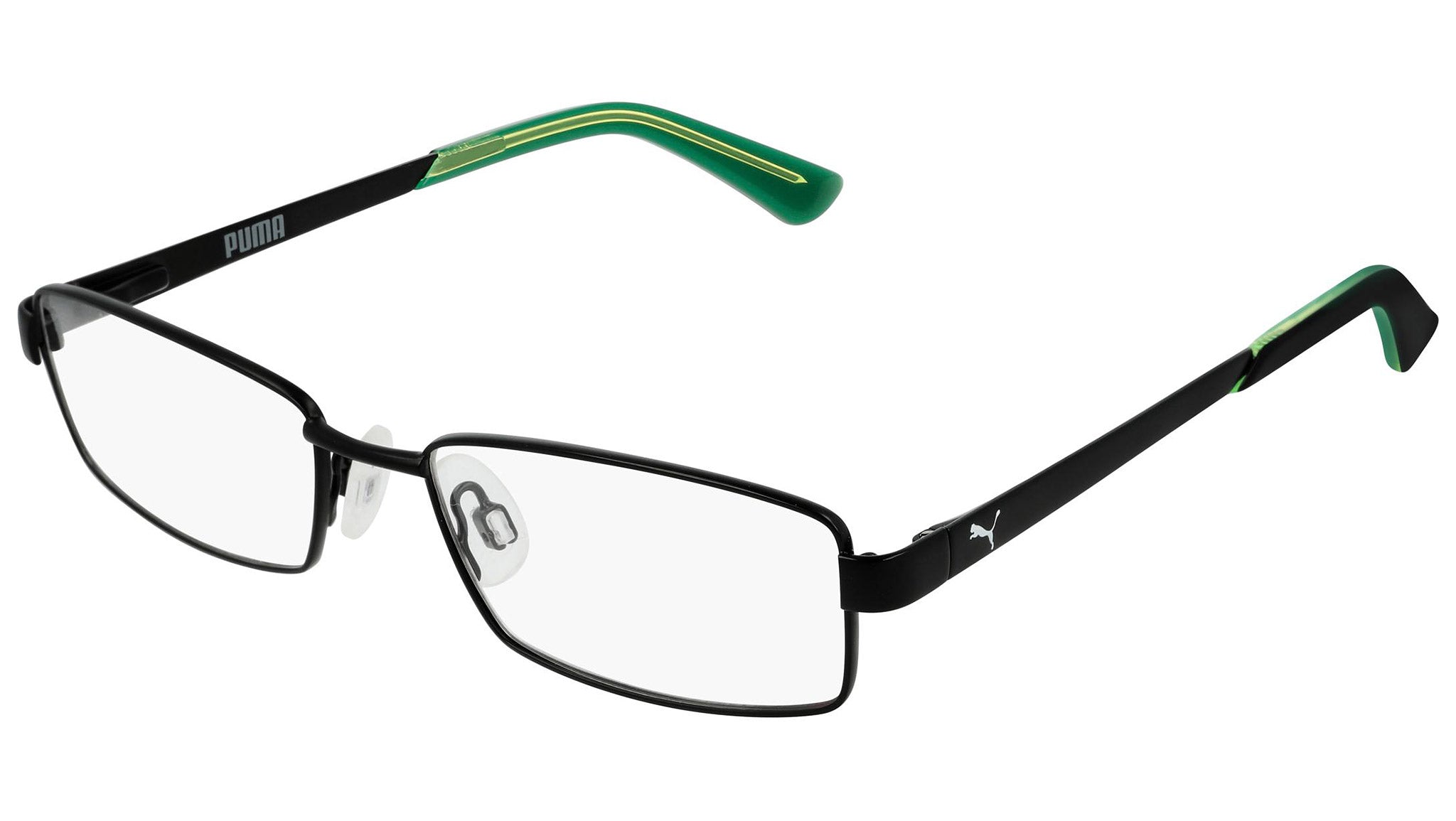 Puma for Kids model PJ0012O 006 matte varnish black optical frame. These kids are on the move. They roam the streets in search for recognition, emotions and daily kicks: celebrating with friends at the Luna Park, a thrilling jump, a trick on a skateboard, or simply seeing something new.