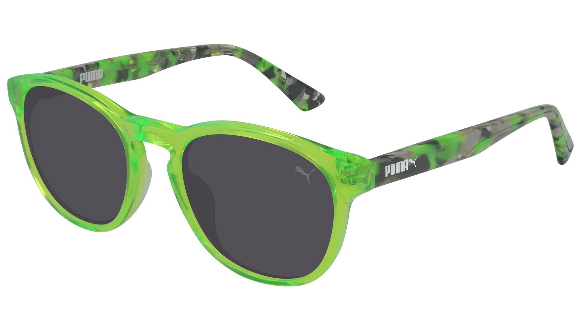 Puma for Kids model PJ0023S 009 shiny transparent fluo green sunglasses, with grey lenses. These kids are on the move. They roam the streets in search for recognition, emotions and daily kicks: celebrating with friends at the Luna Park, a thrilling jump, a trick on a skateboard, or simply seeing something new.