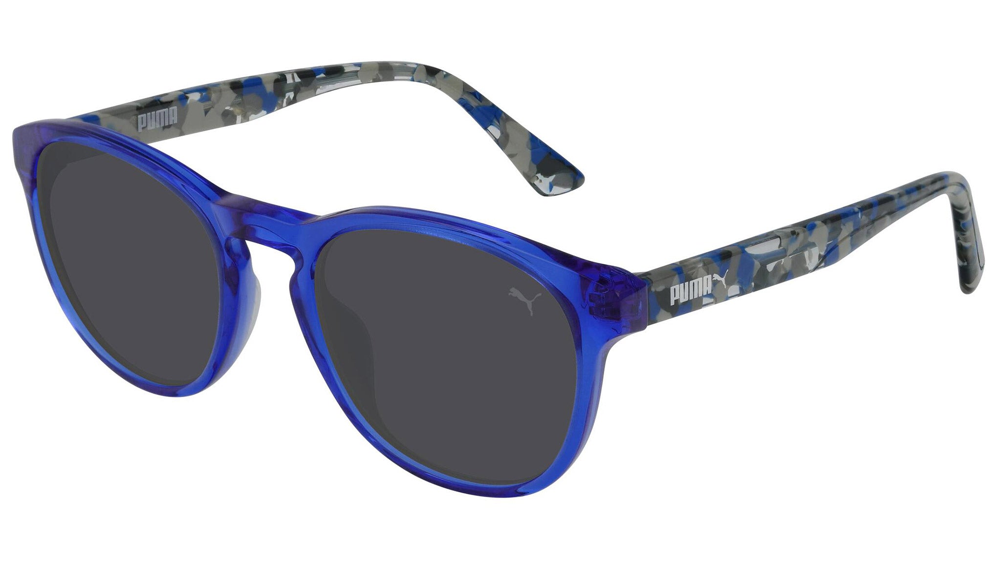 Puma for Kids model PJ0023S 012 shiny transparent fluo blue sunglasses, with grey lenses. These kids are on the move. They roam the streets in search for recognition, emotions and daily kicks: celebrating with friends at the Luna Park, a thrilling jump, a trick on a skateboard, or simply seeing something new.