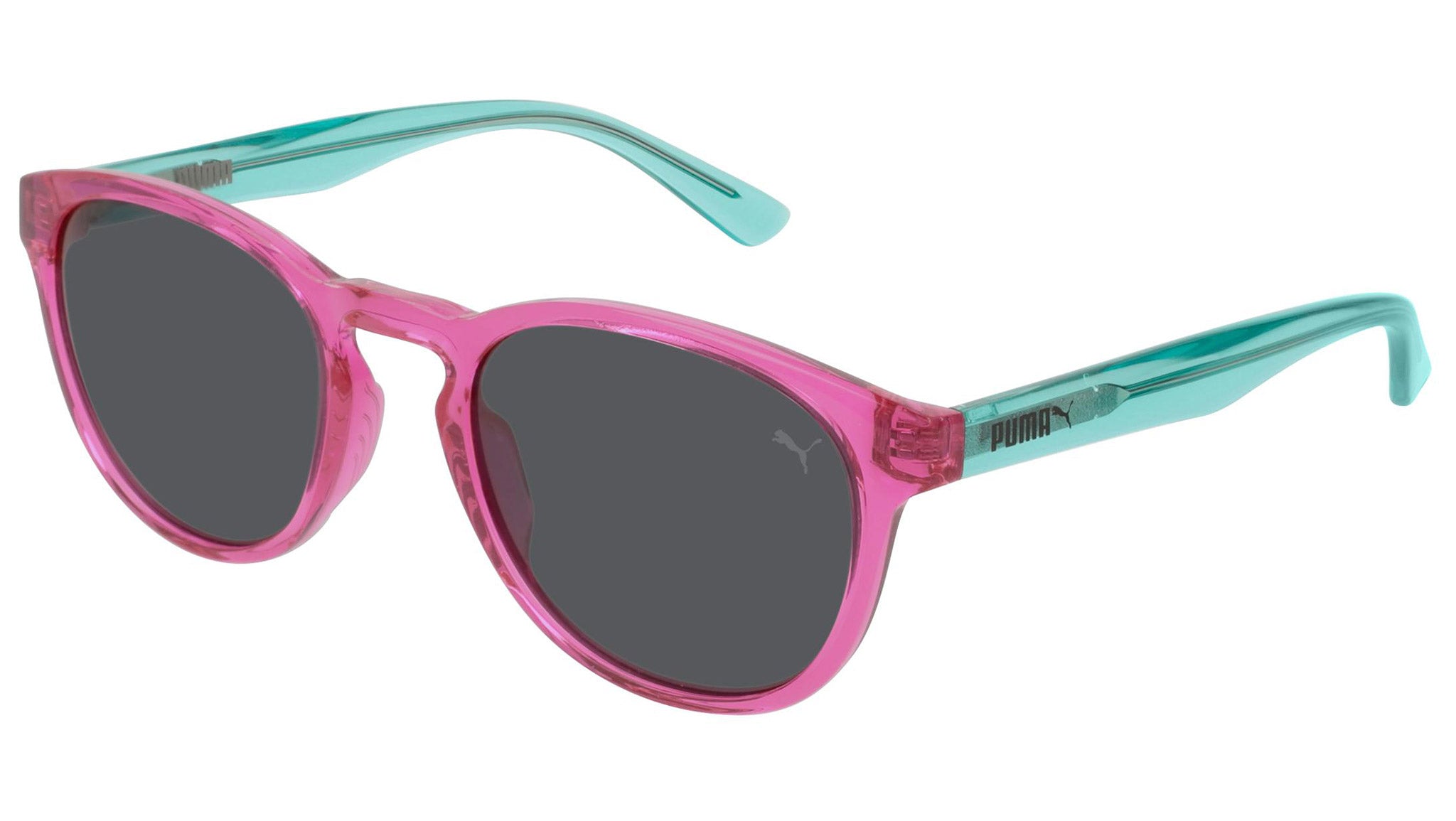 Puma for Kids model PJ0024S 006 shiny transparent fluo pink sunglasses, with grey lenses. These kids are on the move. They roam the streets in search for recognition, emotions and daily kicks: celebrating with friends at the Luna Park, a thrilling jump, a trick on a skateboard, or simply seeing something new.