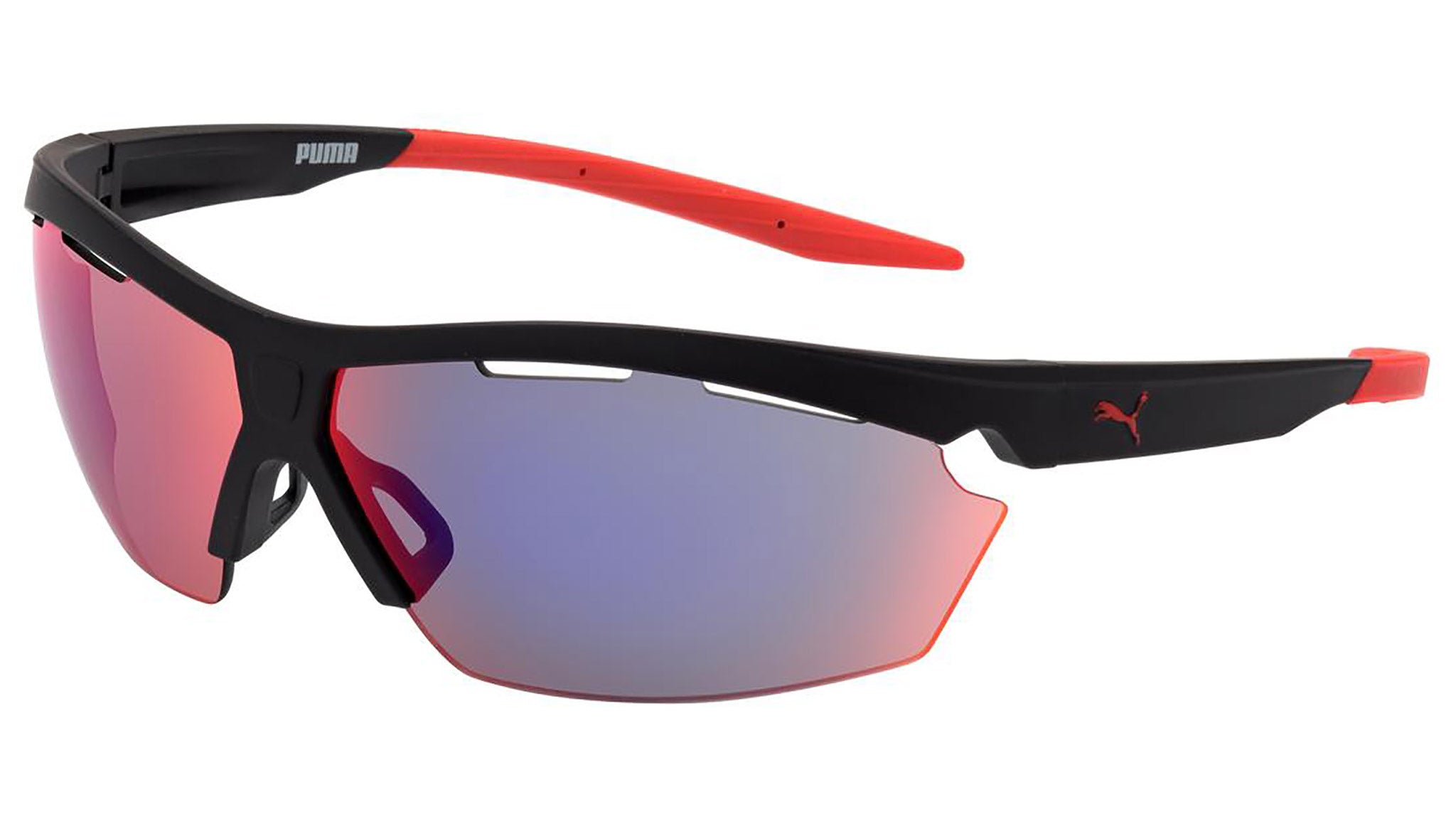 Puma Eyewear model PU0005S 002 matte black sunglasses, with red lenses. Puma Eyewear merges performance and trends, innovation and fashion, sport and lifestyle, for those who see beyond trends and challenge the norm to move things forward.
