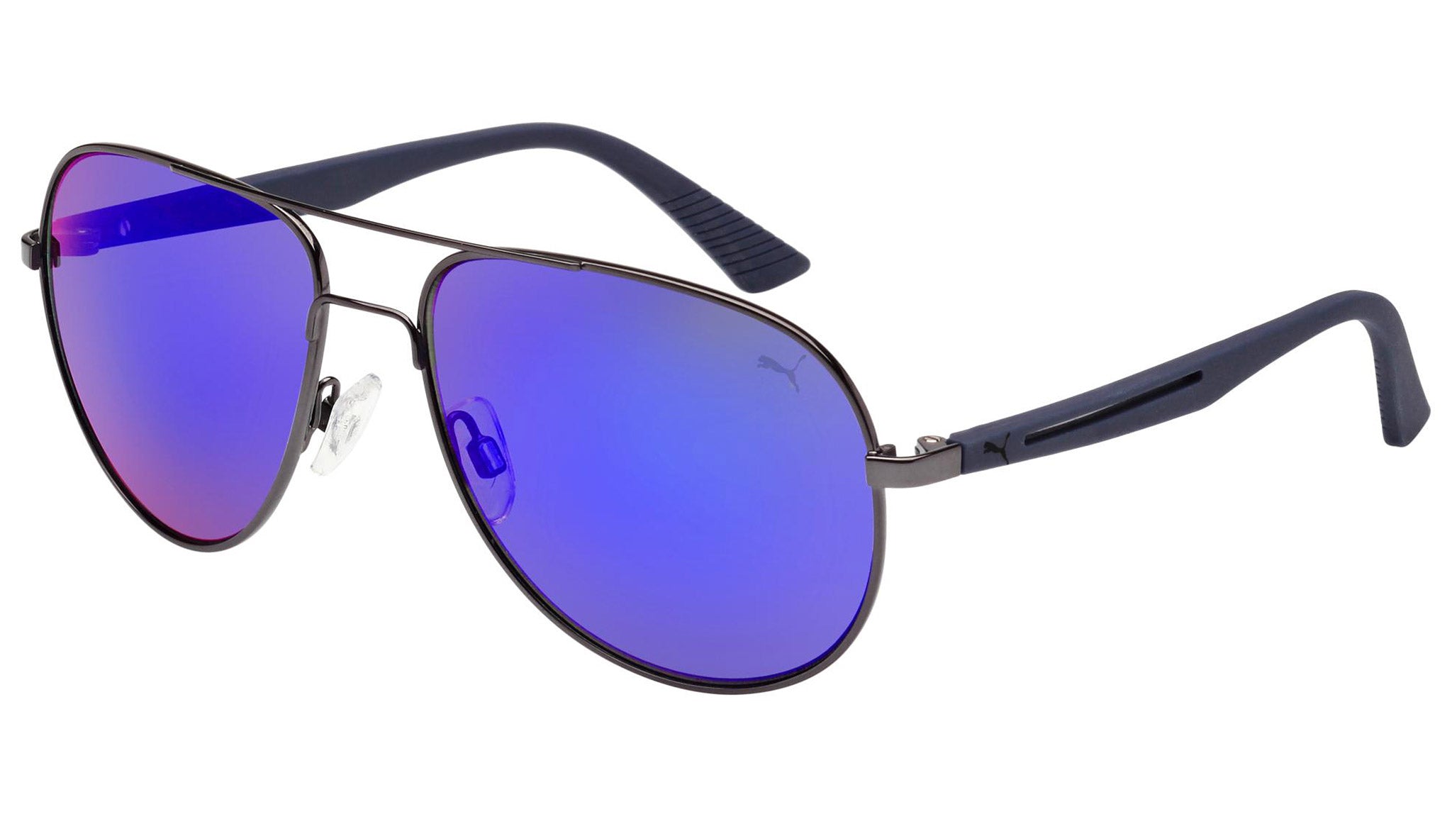 Puma Eyewear model PU0007S 004 shiny dark ruthenium sunglasses, with blue lenses. Puma Eyewear merges performance and trends, innovation and fashion, sport and lifestyle, for those who see beyond trends and challenge the norm to move things forward.