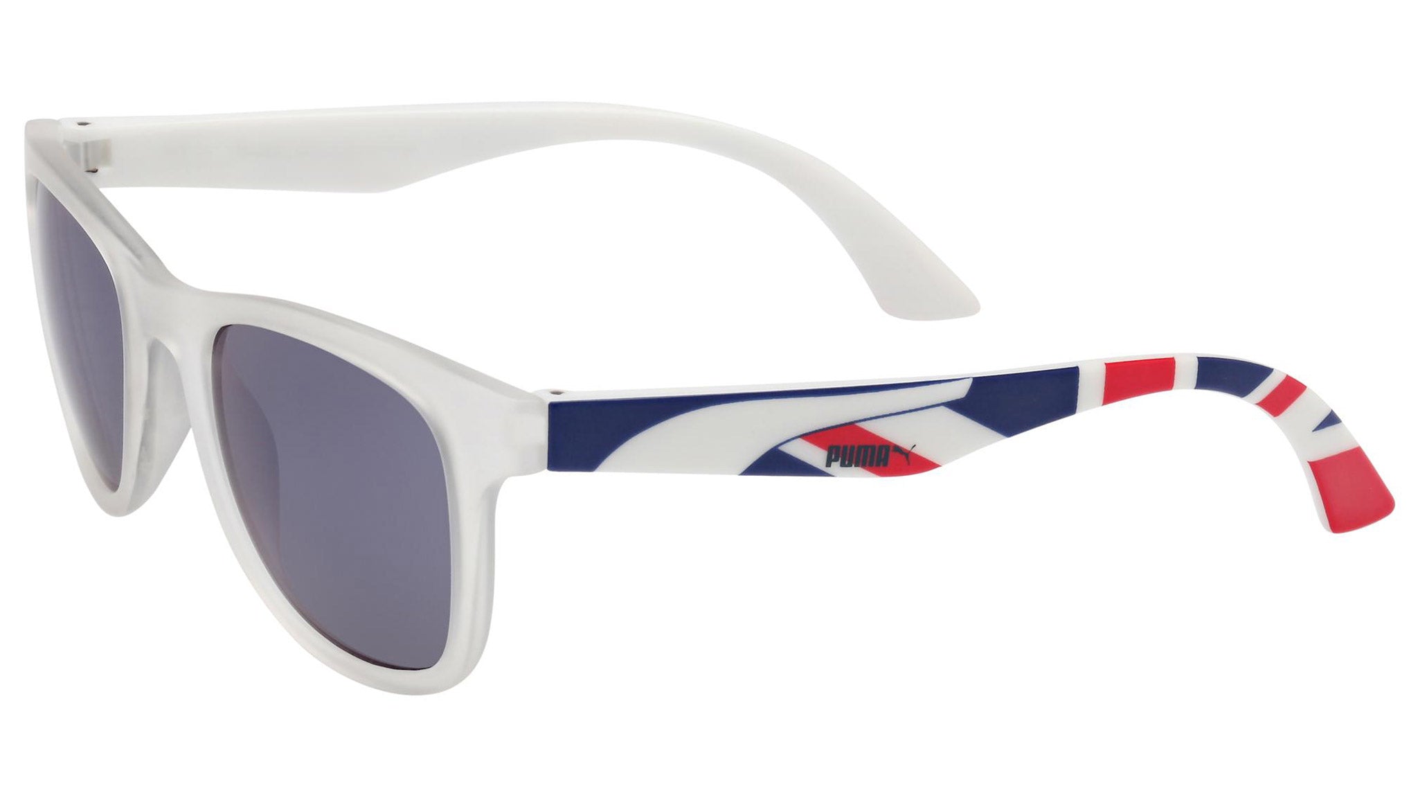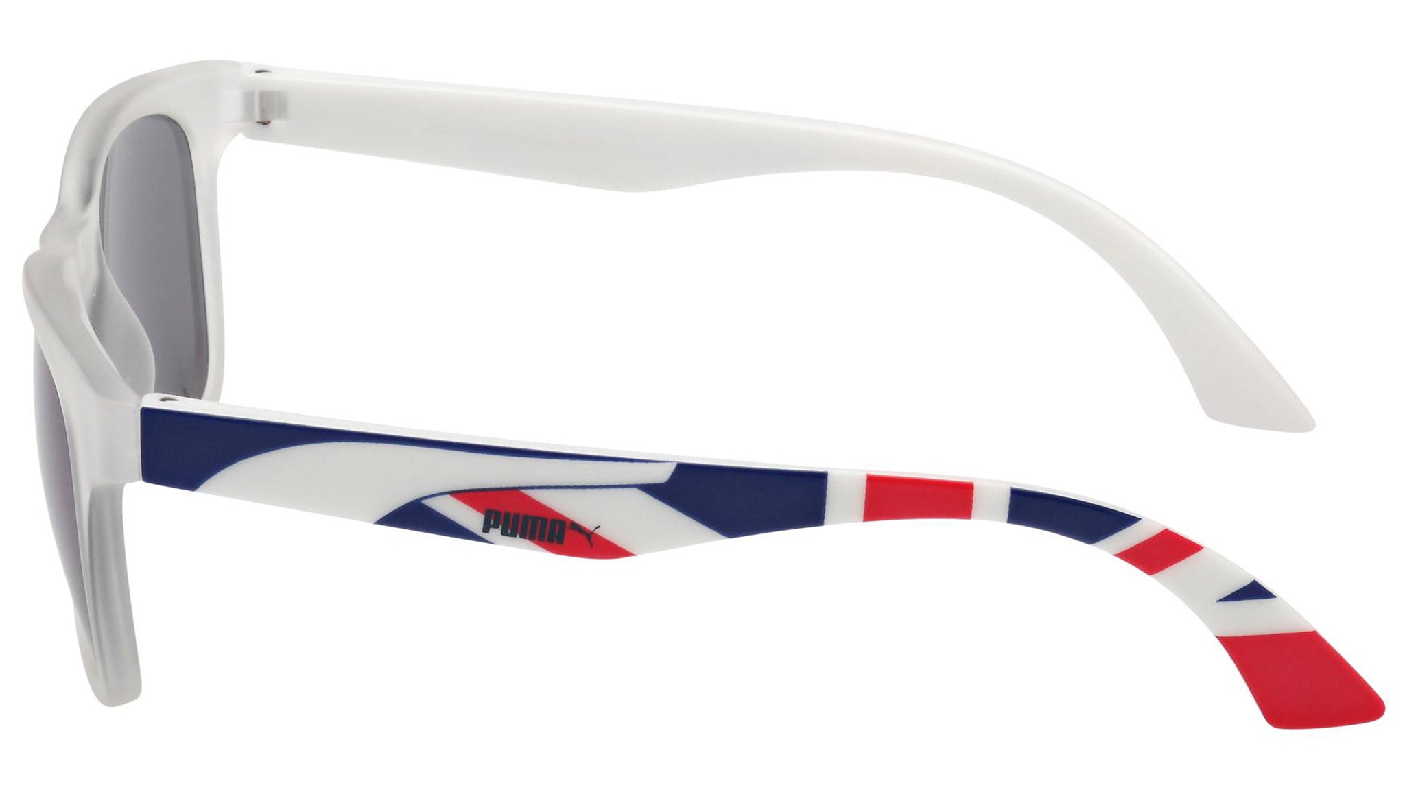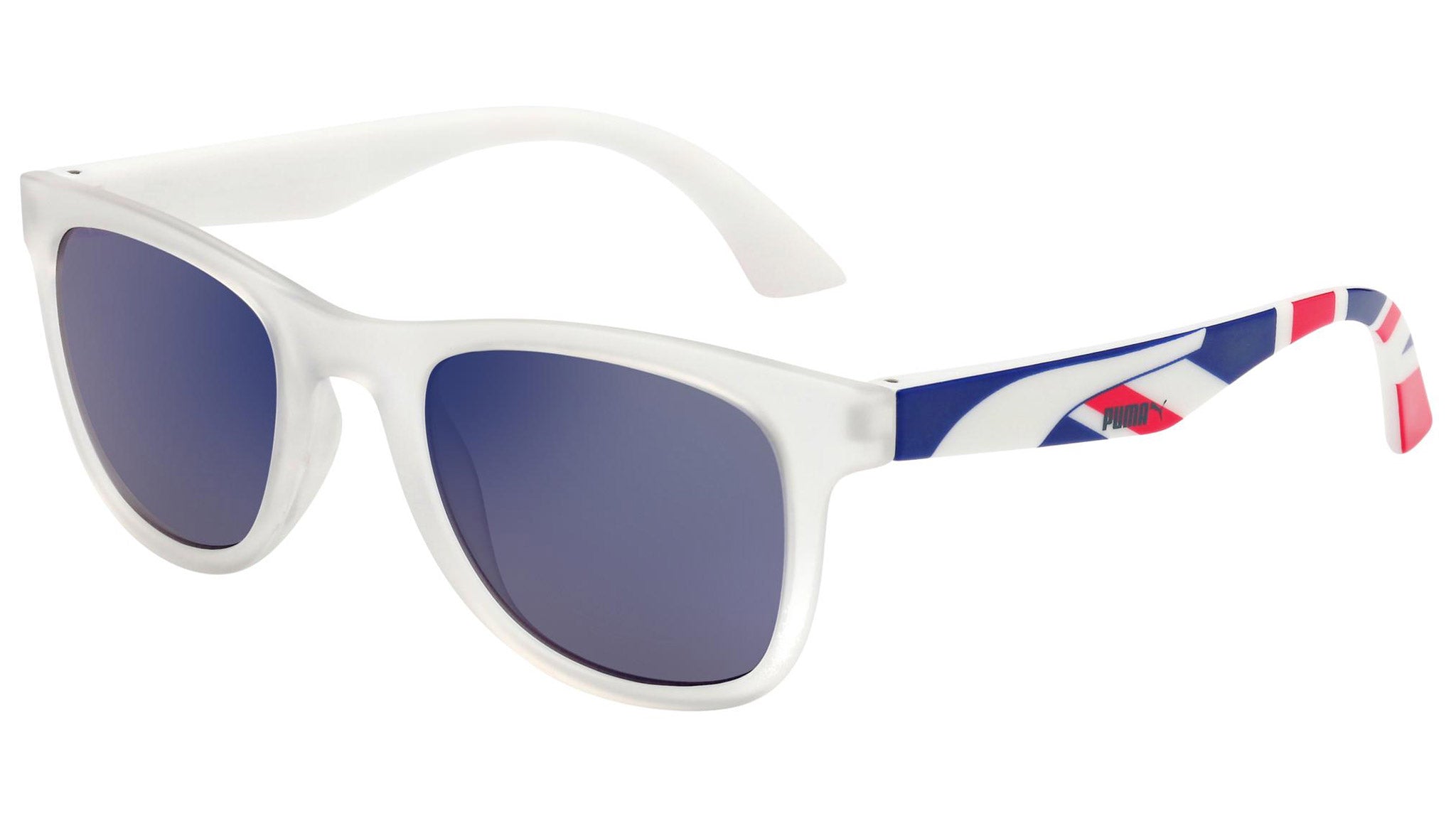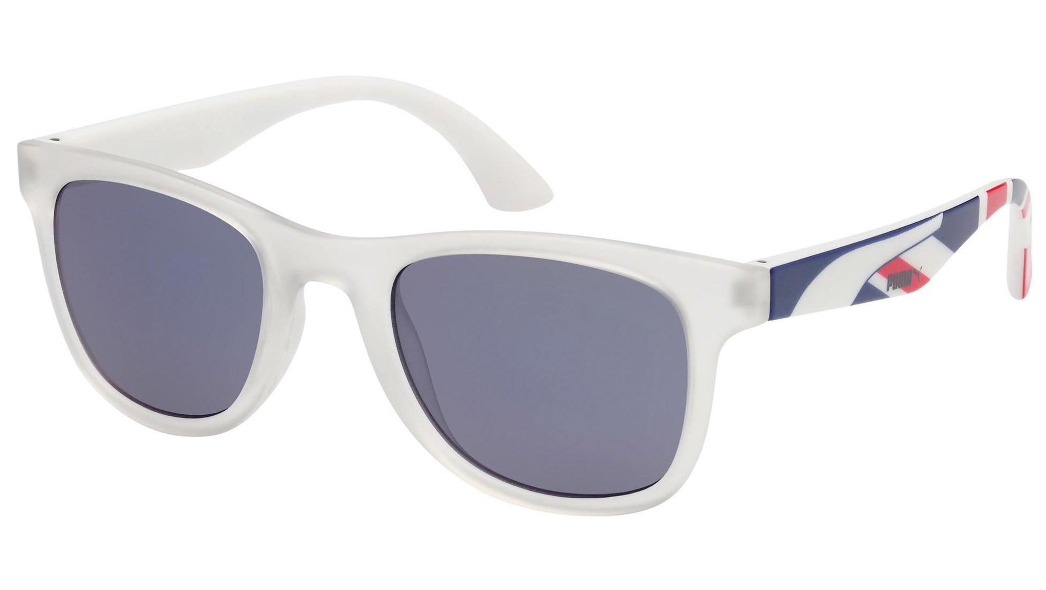Puma Eyewear model PU0012S 006 matte crystal sunglasses, with blue lenses. Puma Eyewear merges performance and trends, innovation and fashion, sport and lifestyle, for those who see beyond trends and challenge the norm to move things forward.