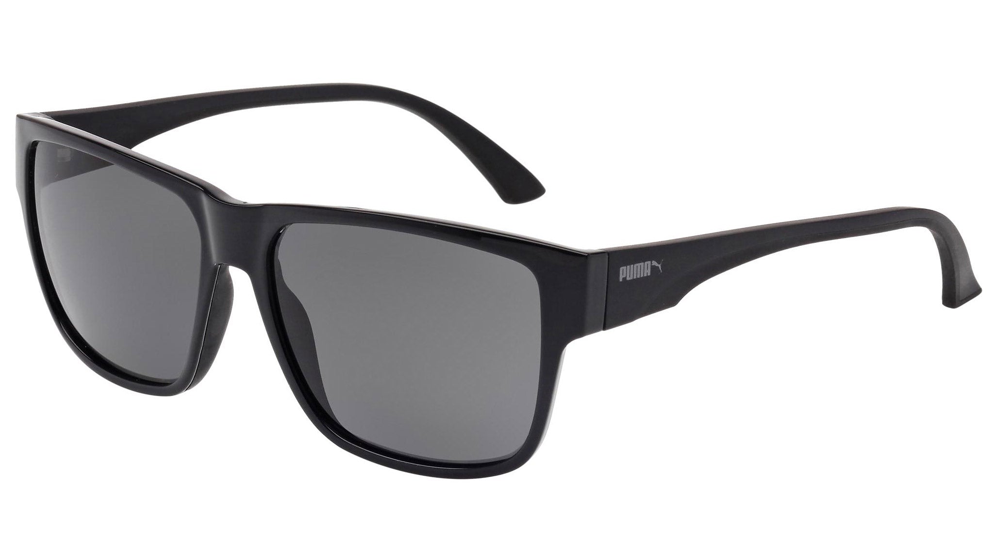 Puma Eyewear model PU0014S 001 shiny black sunglasses, with grey lenses. Puma Eyewear merges performance and trends, innovation and fashion, sport and lifestyle, for those who see beyond trends and challenge the norm to move things forward.