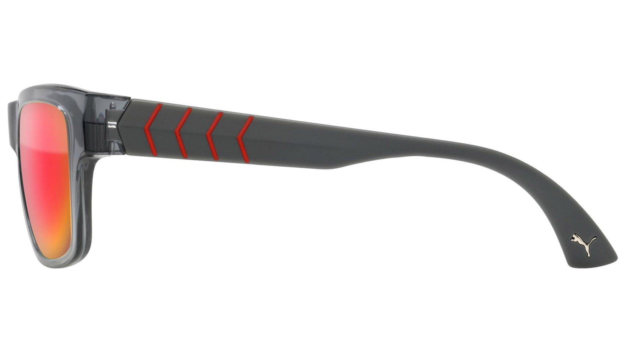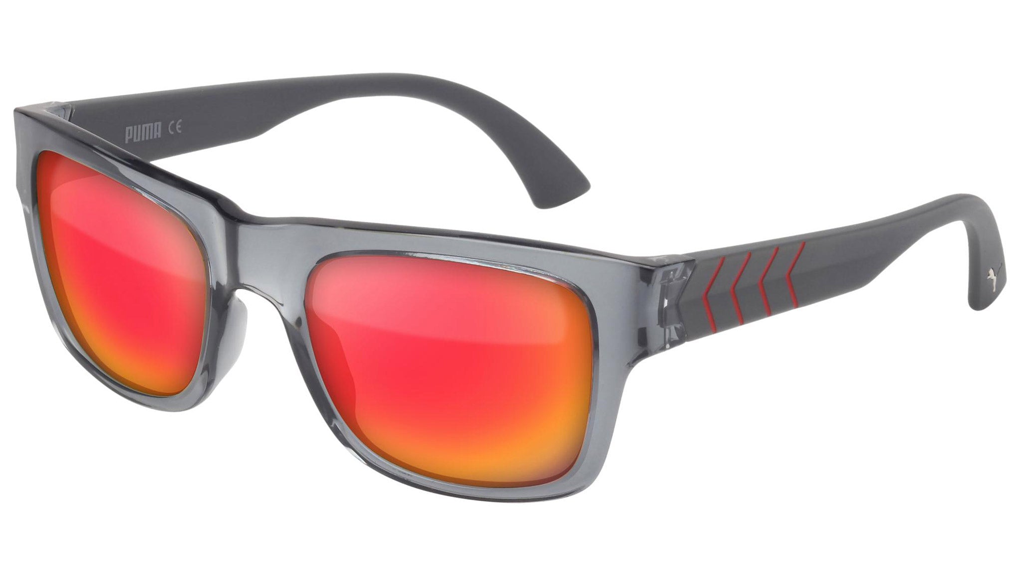Puma Eyewear model PU0038S 005 shiny transparent dark grey sunglasses, with orange lenses. Puma Eyewear merges performance and trends, innovation and fashion, sport and lifestyle, for those who see beyond trends and challenge the norm to move things forward.