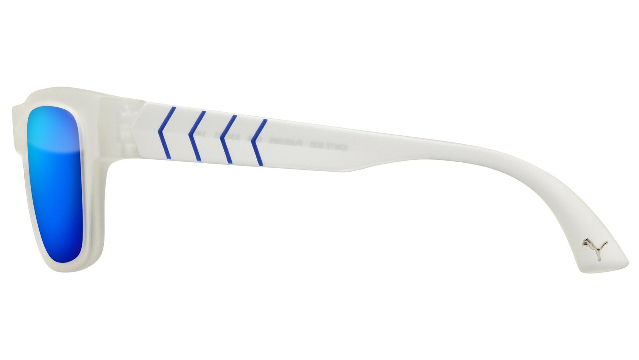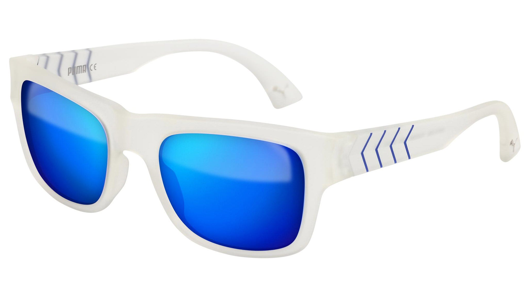 Puma Eyewear model PU0038S 008 semimatte crystal sunglasses, with blue lenses. Puma Eyewear merges performance and trends, innovation and fashion, sport and lifestyle, for those who see beyond trends and challenge the norm to move things forward.
