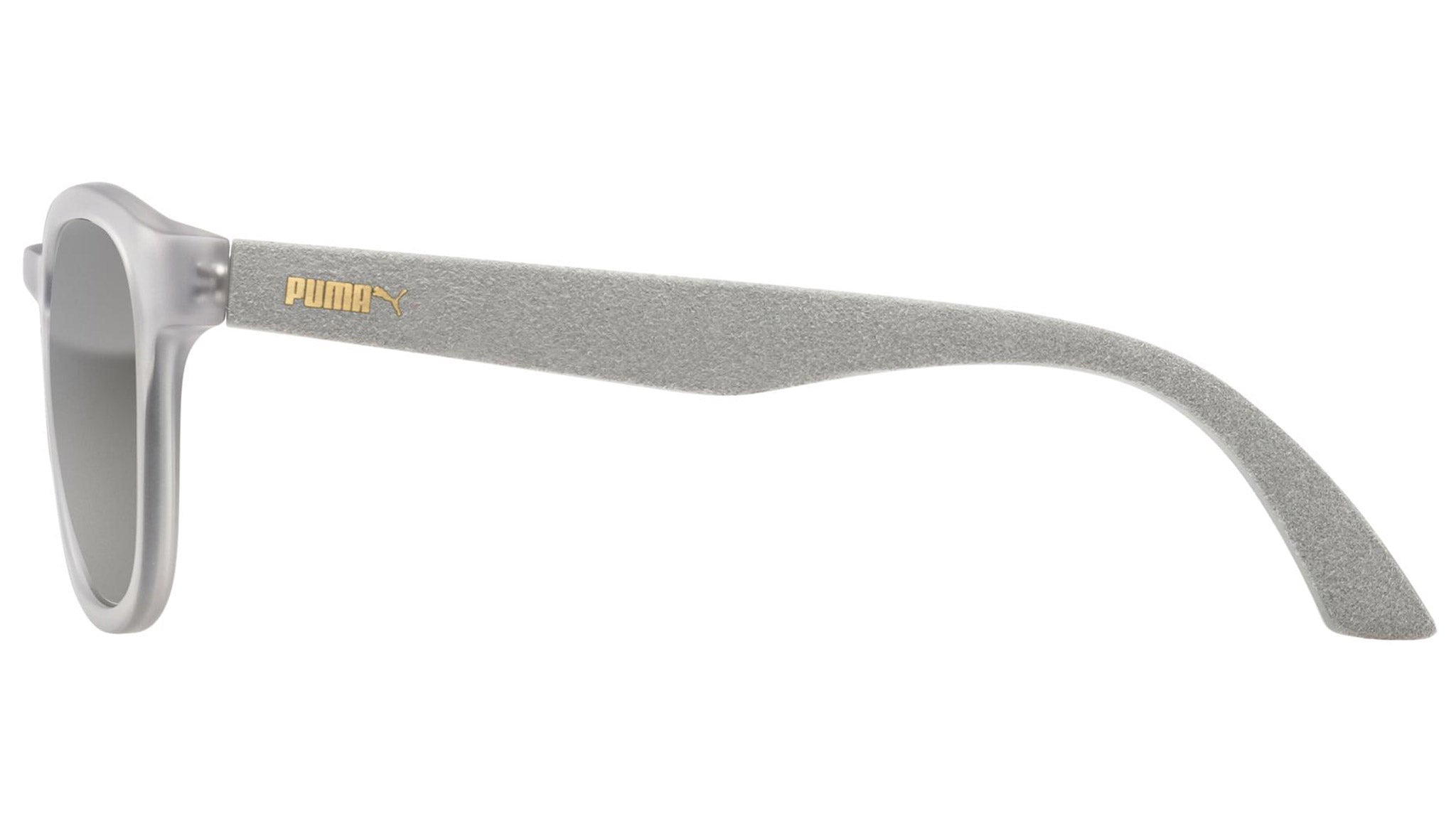 Puma Eyewear model PU0042S 005 matte transparent light grey sunglasses, with grey lenses. Puma Eyewear merges performance and trends, innovation and fashion, sport and lifestyle, for those who see beyond trends and challenge the norm to move things forward.