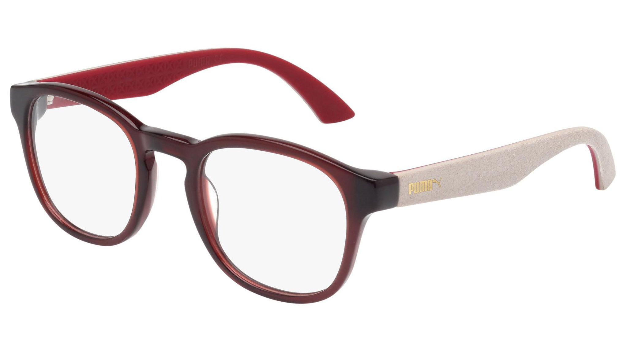 Puma Eyewear model PU0043O 006 shiny dark burgundy optical frame. Designed to fit the movers and the shakers, who seek a dynamic lifestyle. Puma Eyewear is for the hustler, the bold and the Active, for those who see beyond trends and challenge the norm to move things forward.