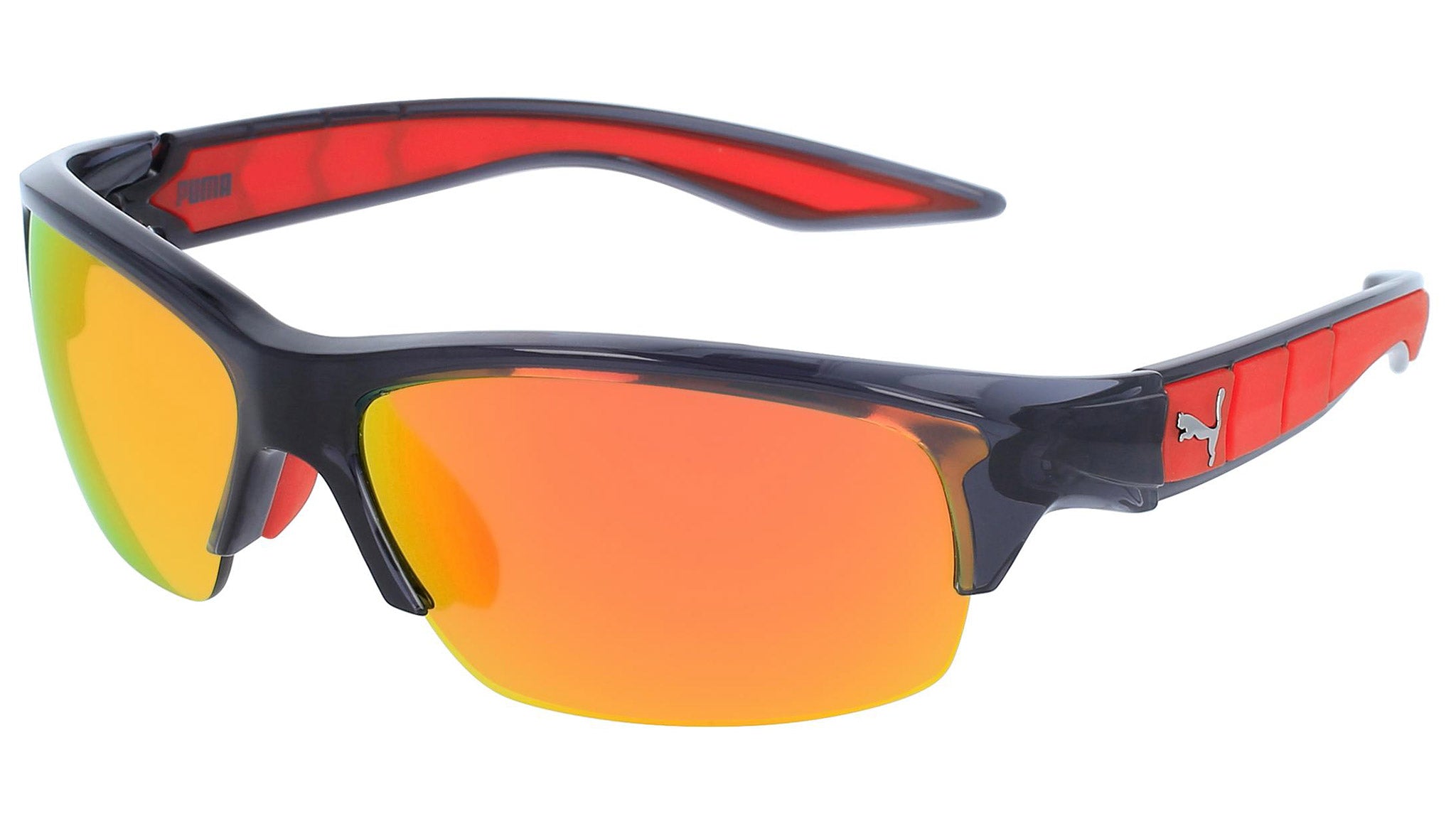 Puma Eyewear model PU0055S 004 transparent dark grey sunglasses, with orange lenses. Puma Eyewear merges performance and trends, innovation and fashion, sport and lifestyle, for those who see beyond trends and challenge the norm to move things forward.