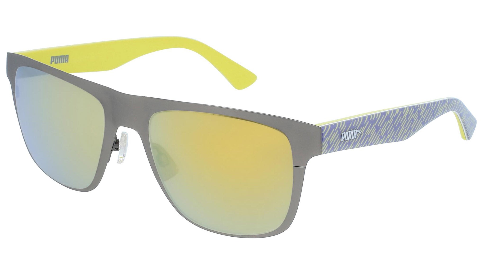 Puma Eyewear model PU0069S 003 semimatte ruthenium sunglasses, with yellow lenses. Puma Eyewear merges performance and trends, innovation and fashion, sport and lifestyle, for those who see beyond trends and challenge the norm to move things forward.