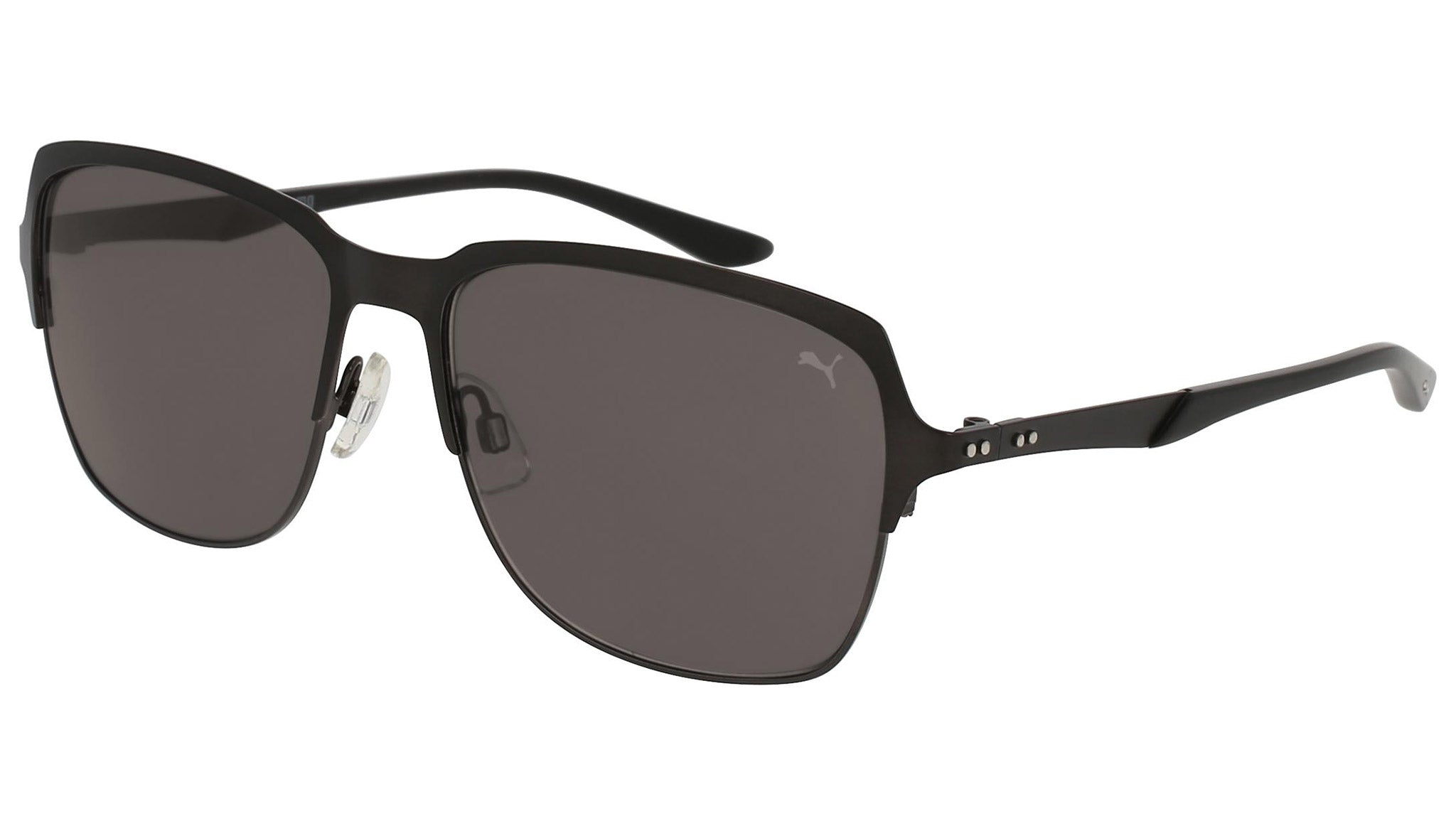Puma Eyewear model PU0092S 003 matte dark ruthenium and shiny dark ruthenium sunglasses, with grey lenses. Puma Eyewear merges performance and trends, innovation and fashion, sport and lifestyle, for those who see beyond trends and challenge the norm to move things forward.