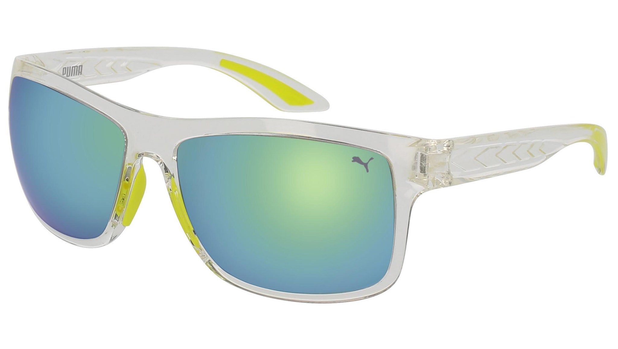 Puma Eyewear model PU0098S 004 shiny crystal sunglasses, with green lenses. Puma Eyewear merges performance and trends, innovation and fashion, sport and lifestyle, for those who see beyond trends and challenge the norm to move things forward.