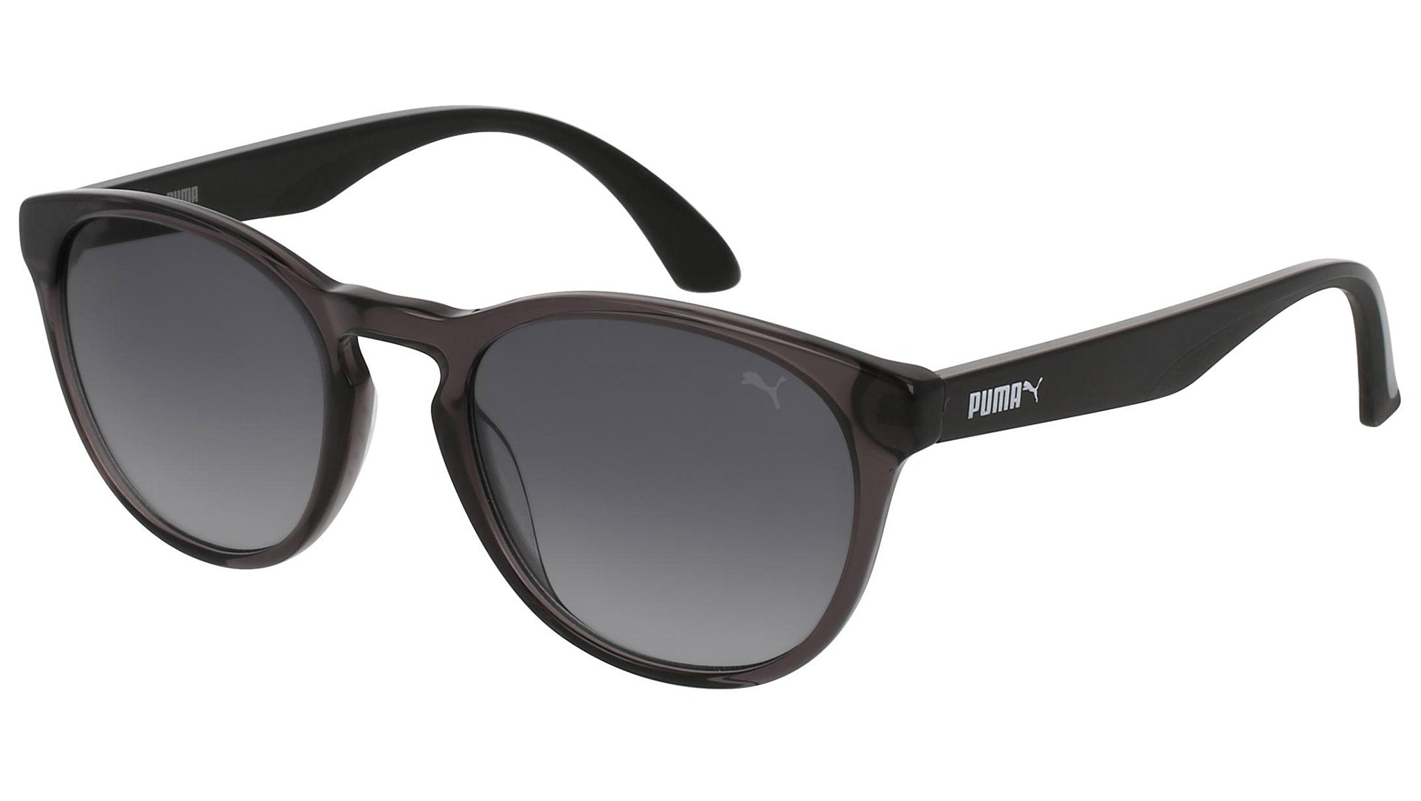Puma Eyewear model PU0105S 006 shiny transparent dark grey sunglasses, with grey lenses. Puma Eyewear merges performance and trends, innovation and fashion, sport and lifestyle, for those who see beyond trends and challenge the norm to move things forward.