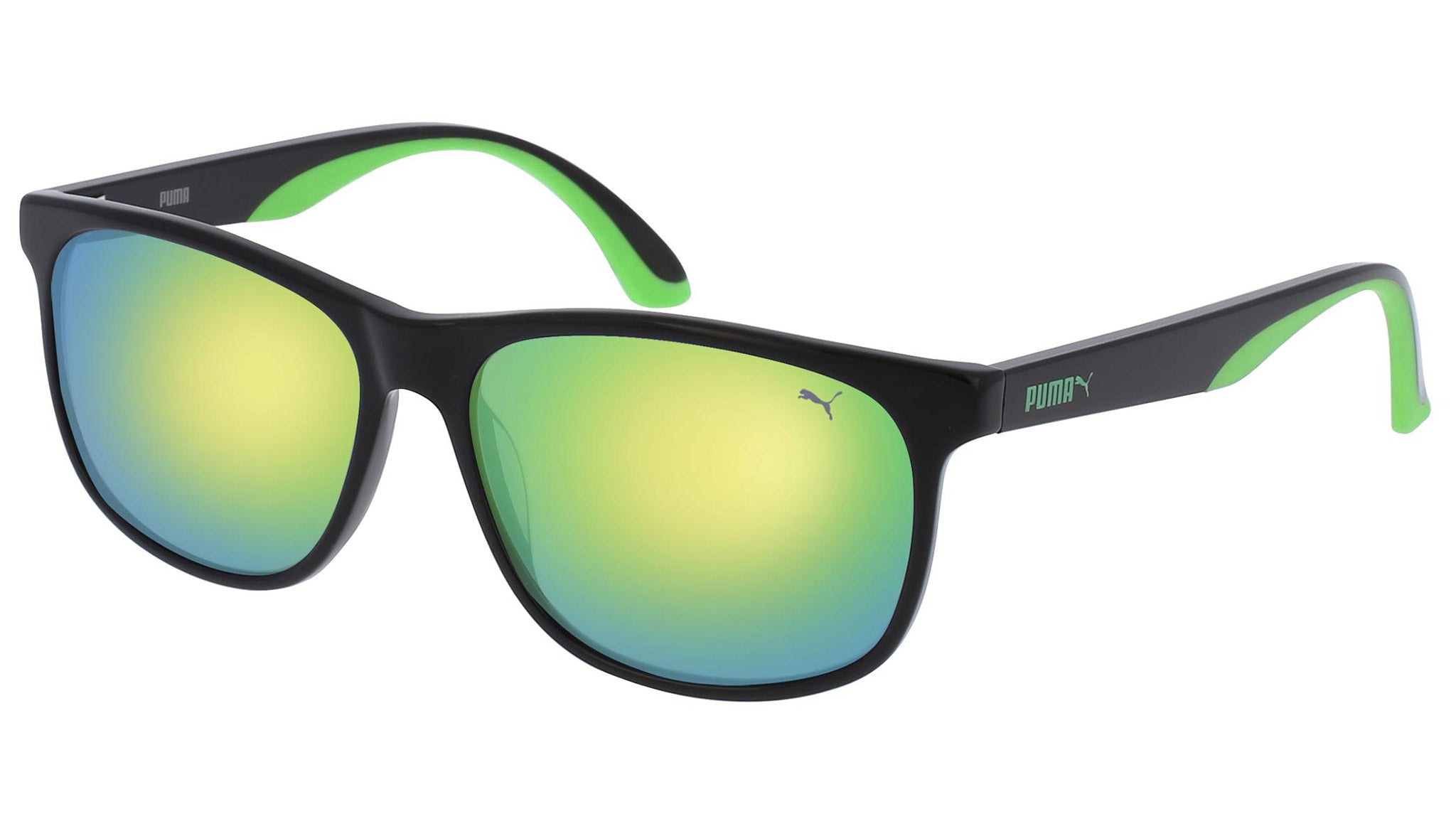 Puma Eyewear model PU0106S 005 shiny black sunglasses, with green lenses. Puma Eyewear merges performance and trends, innovation and fashion, sport and lifestyle, for those who see beyond trends and challenge the norm to move things forward.