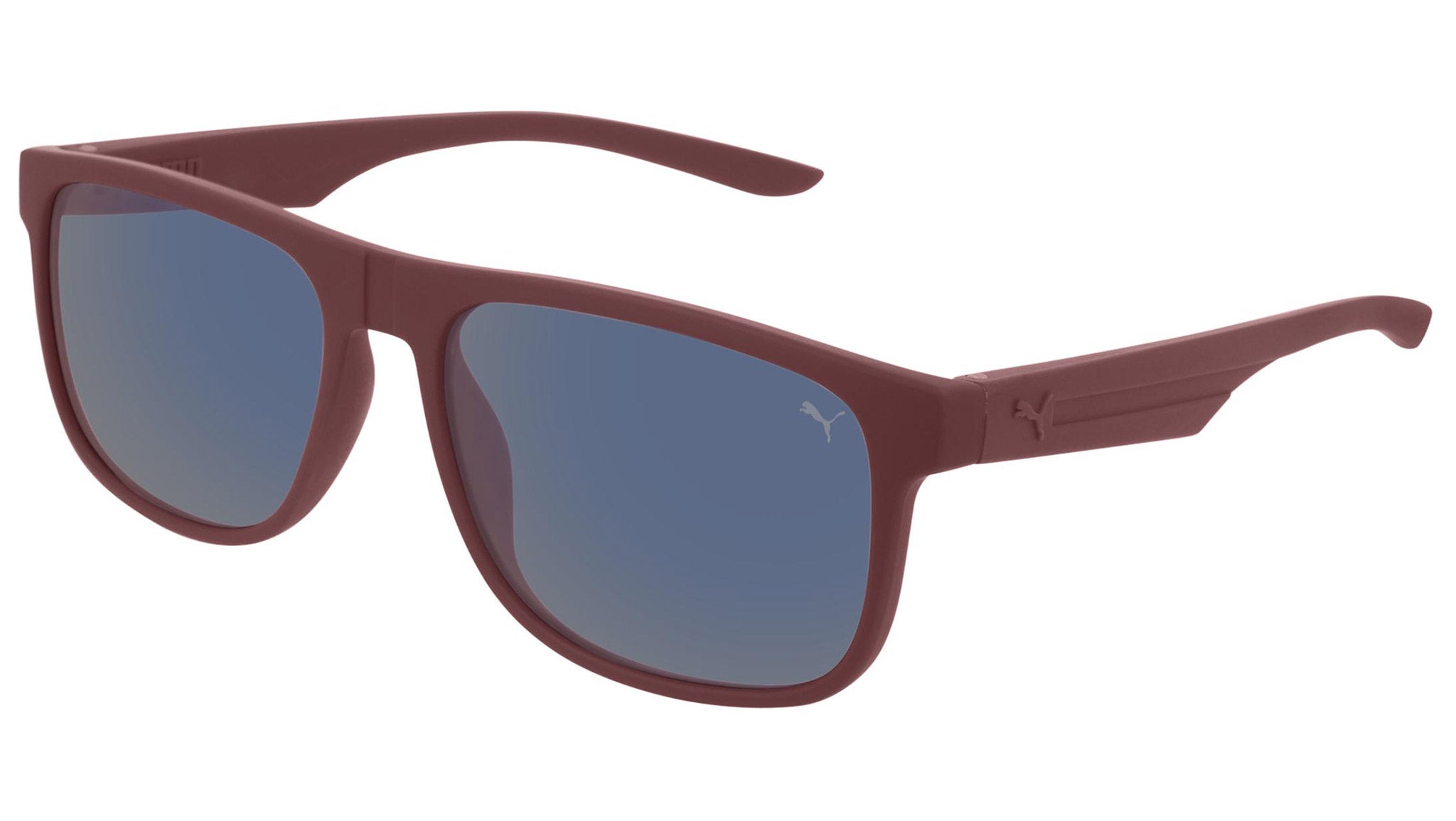 Puma Eyewear model PU0192S 005 solid burgundy rubber sunglasses, with blue lenses. Puma Eyewear merges performance and trends, innovation and fashion, sport and lifestyle, for those who see beyond trends and challenge the norm to move things forward.