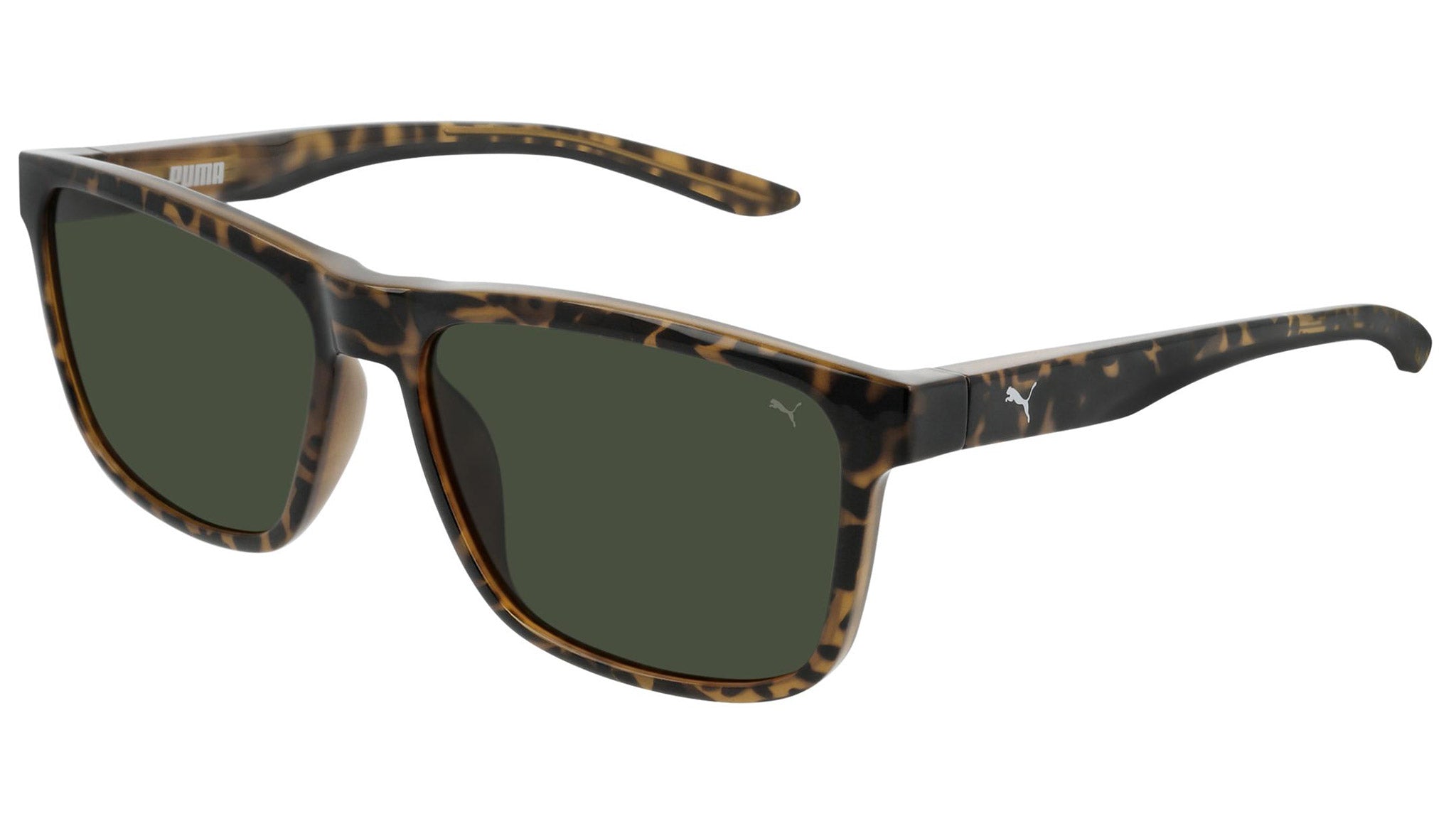 Puma Eyewear model PU0193S 003 classic dark havana shiny sunglasses, with green lenses. Puma Eyewear merges performance and trends, innovation and fashion, sport and lifestyle, for those who see beyond trends and challenge the norm to move things forward.